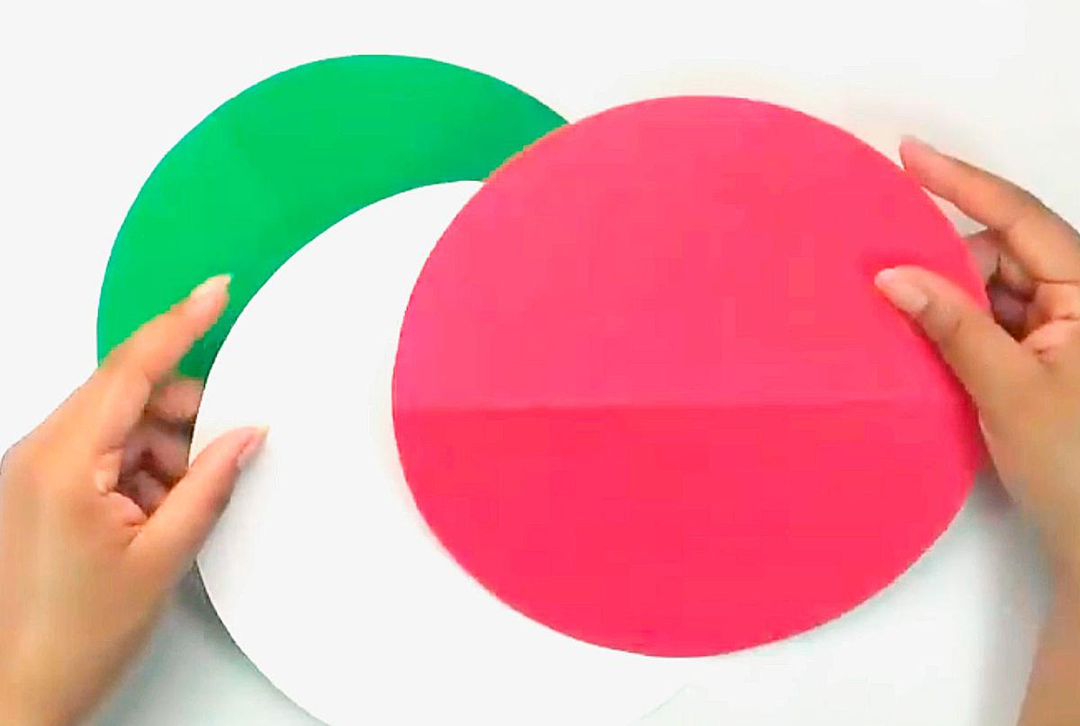 Cortar los círculos a la mitad, corta también unas piezas en forma de gotas en cartulina negra, para formar las pipas de la sandía, en el vídeo te muestro cómo hacerlo de forma fácil.