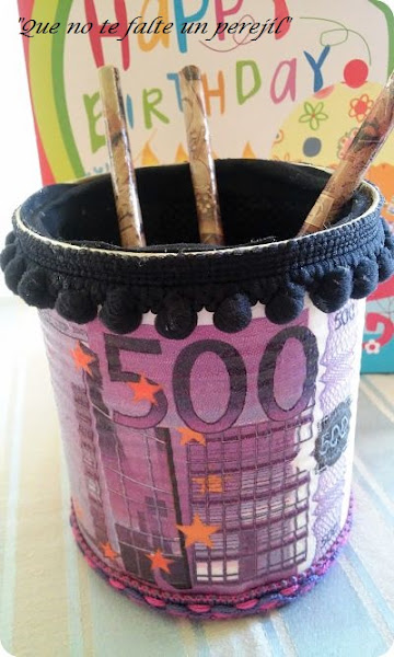 También he hecho este lapicero y una taza decoradas con billetes de 500 euros para mi hermano, pues cuando tiro la casa por la ventana no hay quien me pare. ¡¡ Jajajajaja !!