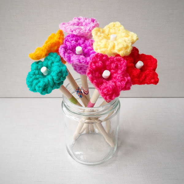 Hola crocheteras! Hoy traigo un patrón super chulo y rápido de hacer, una flor de crochet para ponerla de tope en los lápices que no te llevará más de 5 minutos .