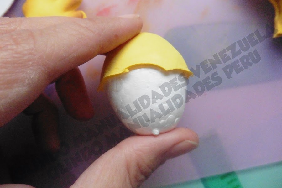 11. Luego pegamos el vestido al huevo de tecnopor.