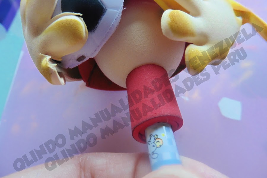 15. Por debajo pegamos un rollito de microporoso para pegar en la parte de abajo de la bolita de tecnopor y sirva de base para introducir el lápiz, observa la foto.