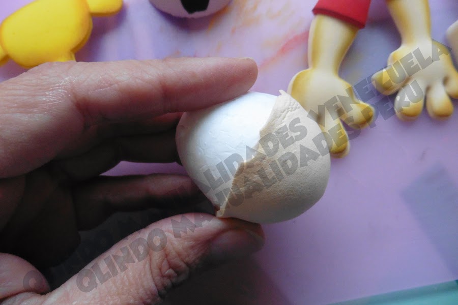 13. Luego tomamos una pelotita de futbol la partimos en dos y pegamos al brazito de nuestro perrito.