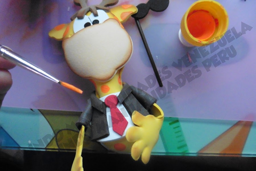 12. Con pintura acrílica naranja pintamos manchitas a nuestra jirafa asi como también los ojitos.