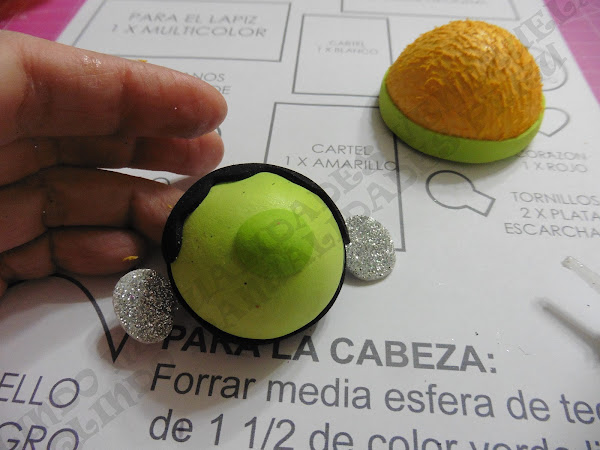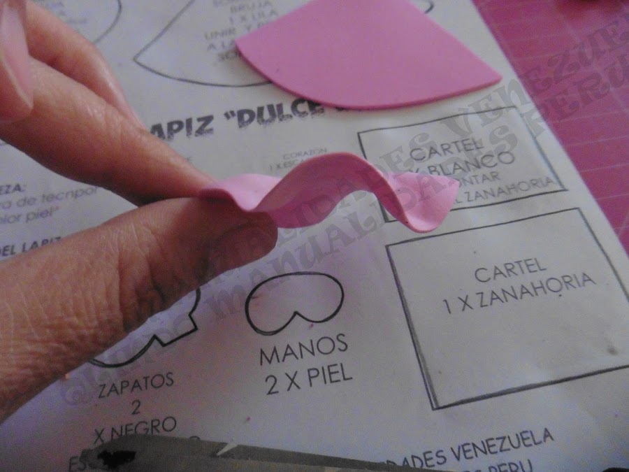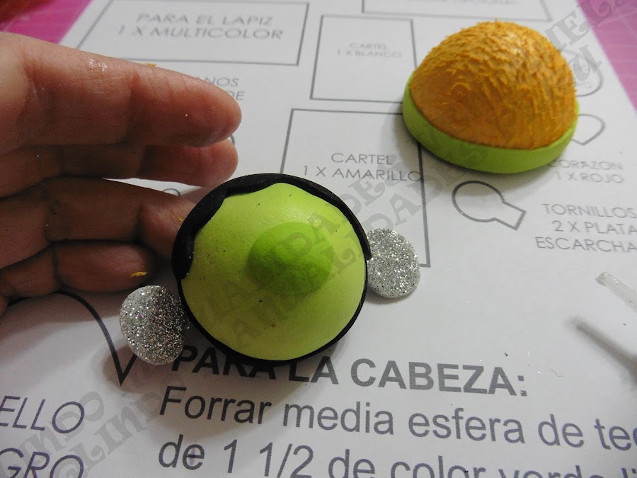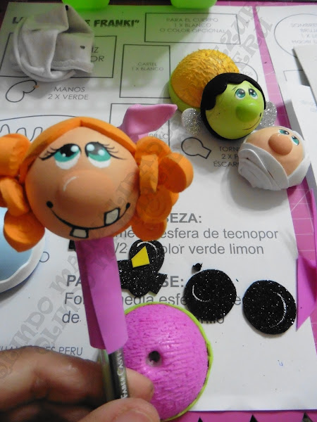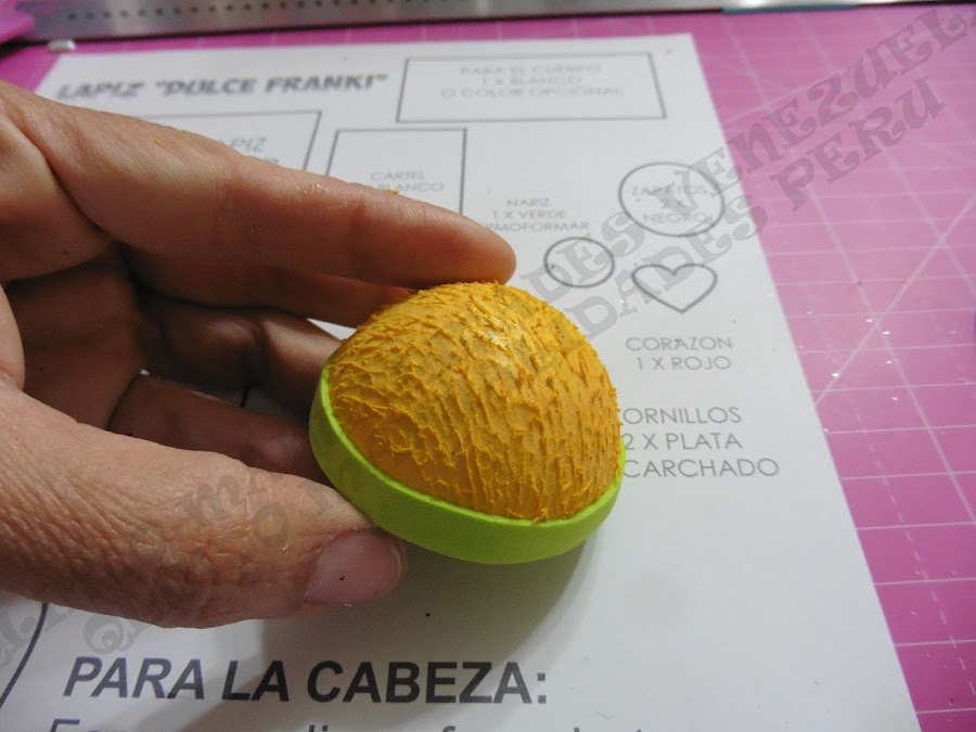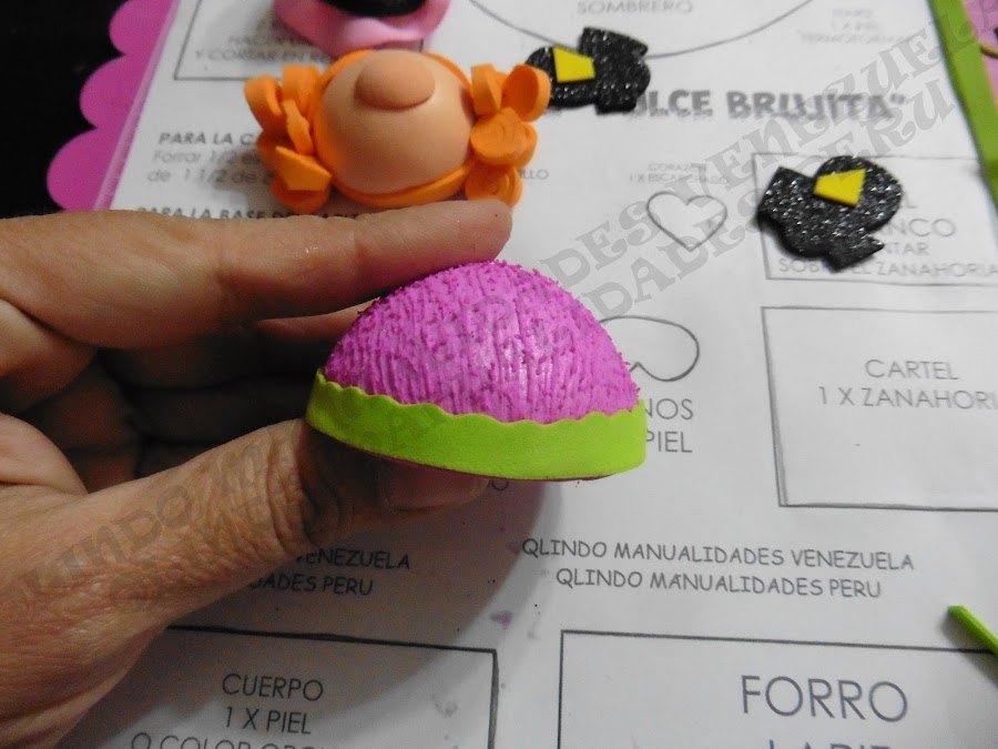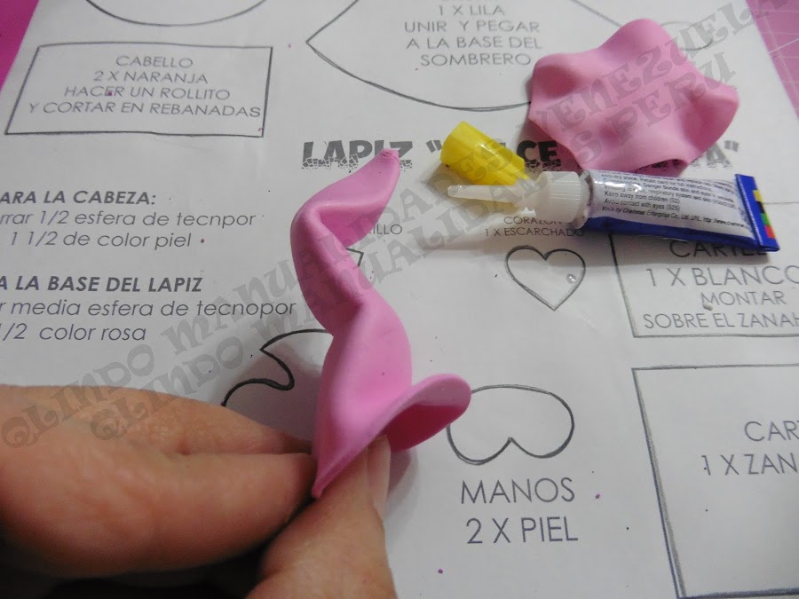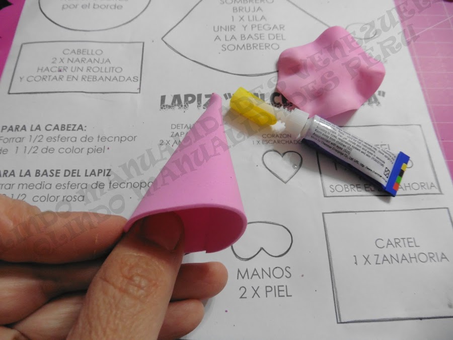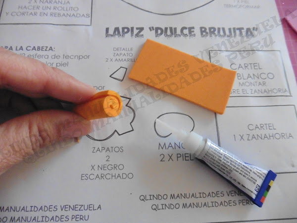 Enrolla el pedacito correspondiente al cuerpo al lapicero y luego pegalo a la cabezita de la brujita, mas adelante te explico como pintarle los ojitos. Observa en la foto que le hice un huequito a la base donde va encajado el lapicero.