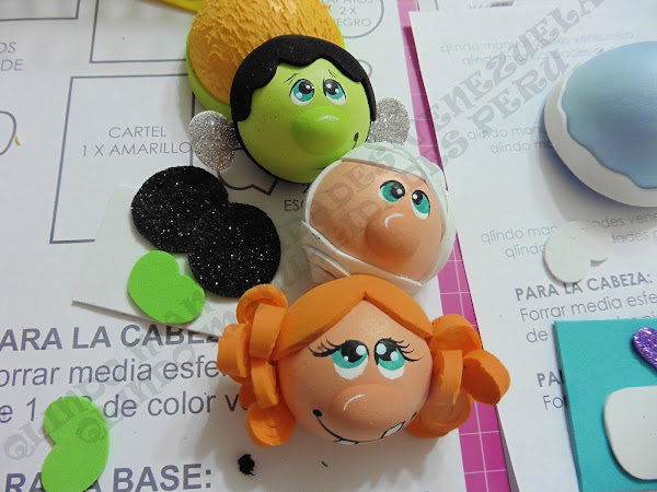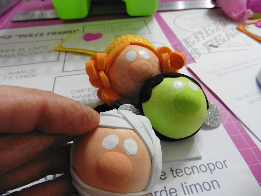 Generalmente cuando uno hace este tipo de manualidades no es uno ni de dos los que va a realizar, casi siempre es de una docena en adelante, así que para detalles como pintar los ojitos les recomiendo que trabajen en serie, por ejemplo en la foto se observa que pinte la parte blanca primero y deje secar, y asi sucesivamente con el resto de las cabezitas.