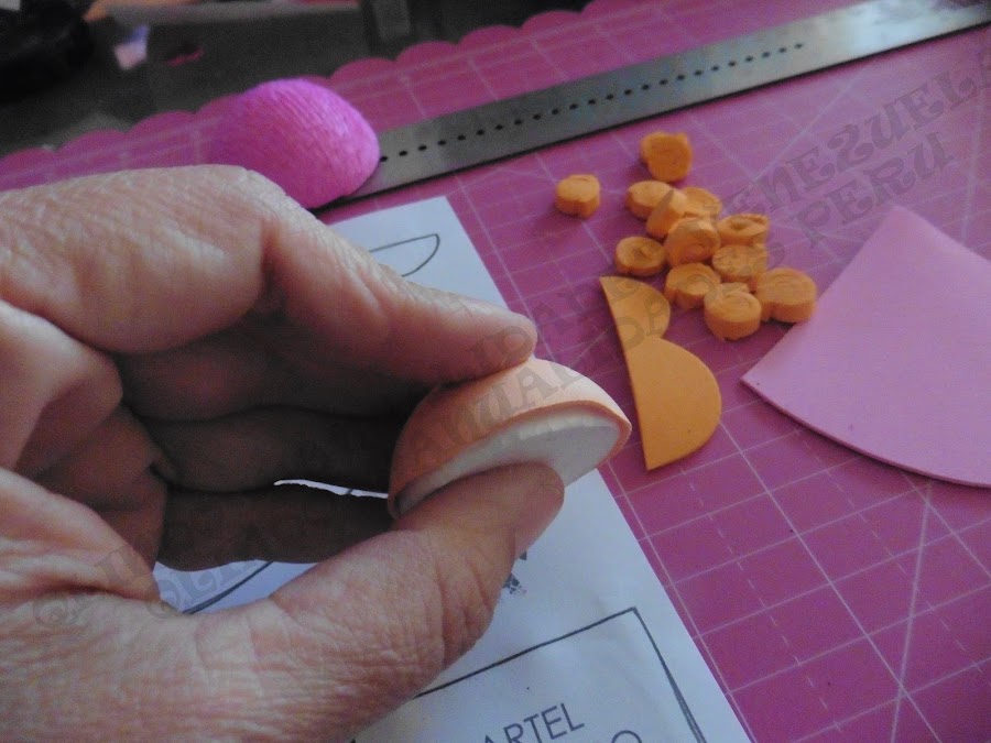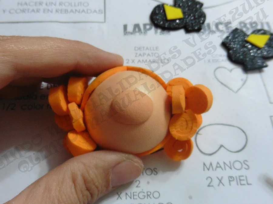 Para el cabello, haz un rollito con las dos piezas naranja y unelas en los extremos con la pega triss o con silicona caliente.