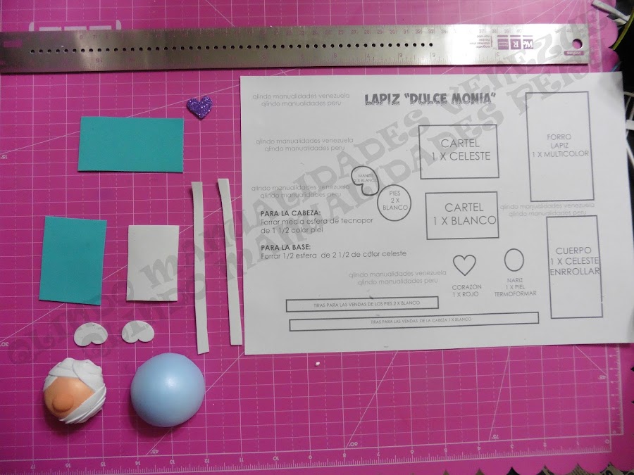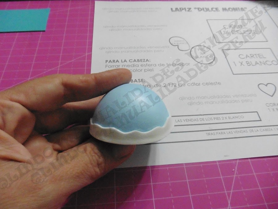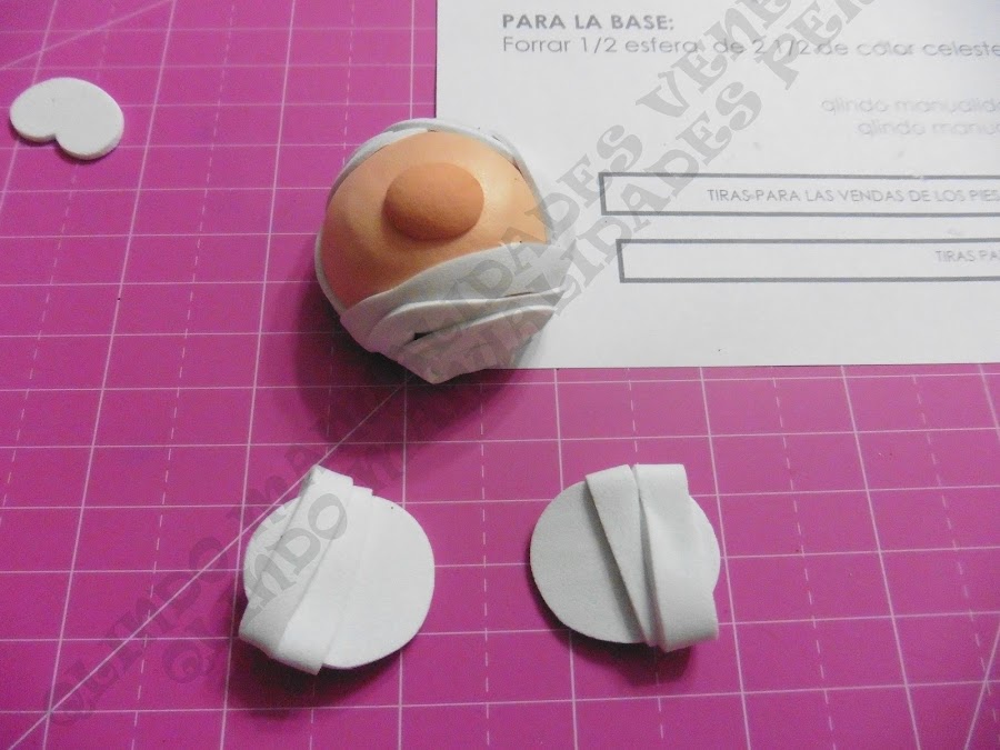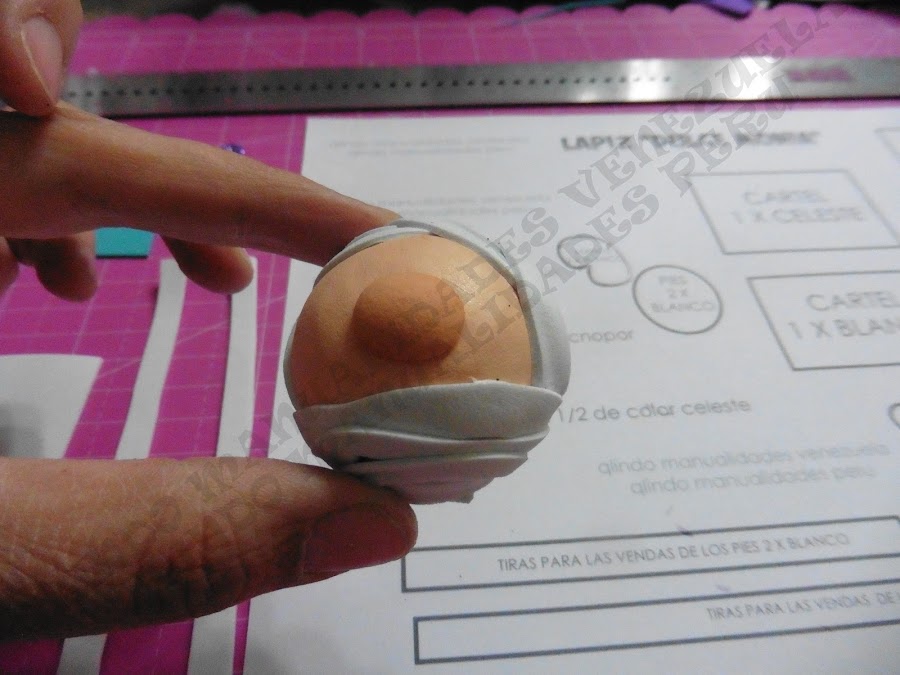 Luego de termoformada la cabecita y pegado la nariz, enrolla la tira blanca que haces las veces de vendas como se muestra en la figura.