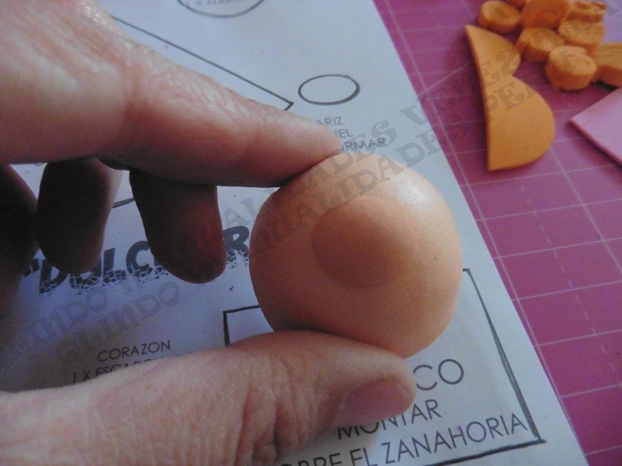 Termoforma una bolita de tecnopor de 1 1/2 con color piel para formar la cabeza, colocale por detrás una tapita en color naranja.