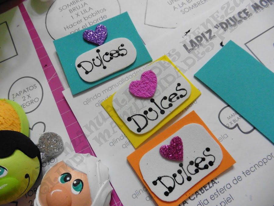 Para elaborar los cartelitos, simplemente escribí la palabra "Dulces" pero ustedes puden colocar el nombre de la persona a la que van obsequiar, o cualquier otro mensaje, para esto yo utilicé un plumón de tinta indeleble de 0.5mm y en los extremos de las letras puse puntitos con pintura acrílica negra.