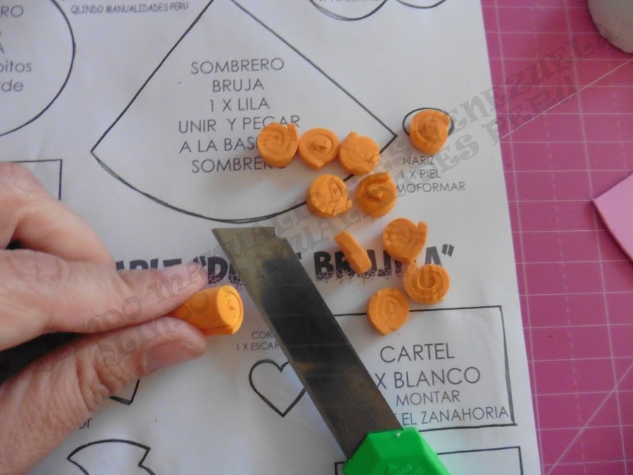Toma un bisturí o cutter y corta el rollito en rodajitas para formar el cabello de la brujita.
