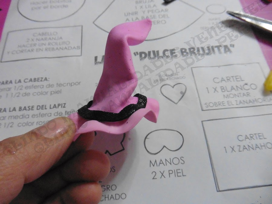 Pega la nariz previamente termoformada a la cabeza de la brujita