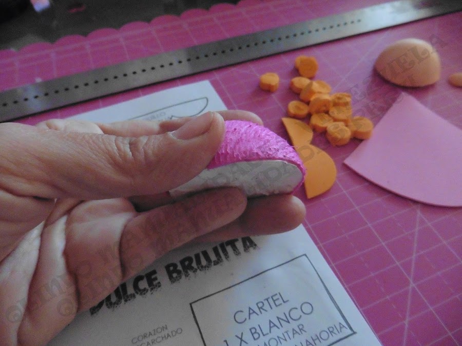 Termoforma el flequillo y pegalo a la cabeza de la brujita.