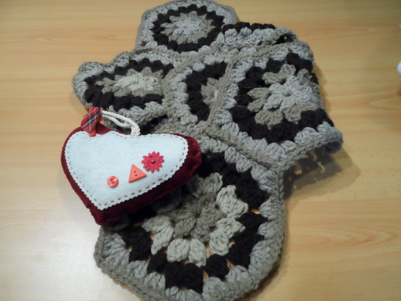 Una bufanda de granis exagonales en tonos marrones preciosa y que ya he estrenado y este corazón de fieltro que ya está luciendo en mi habitación de costura.