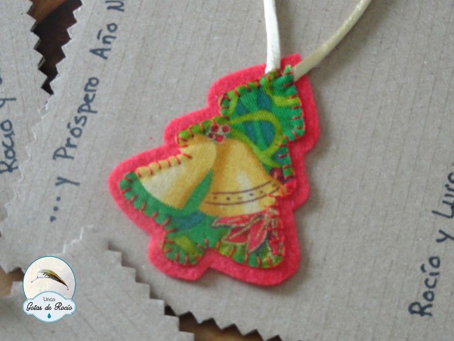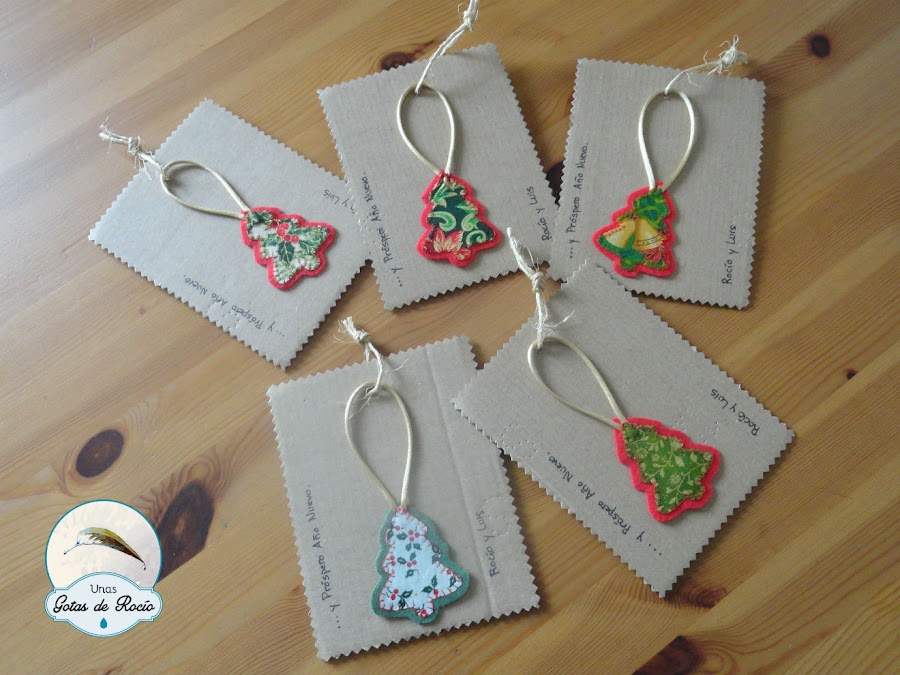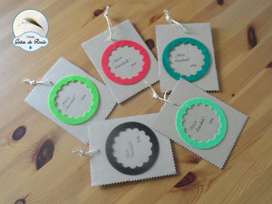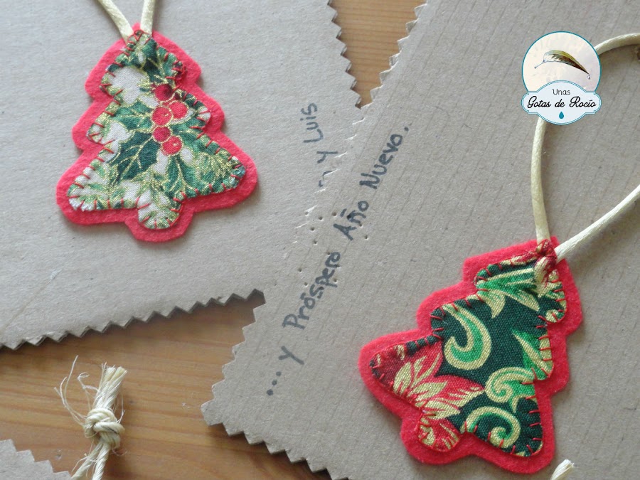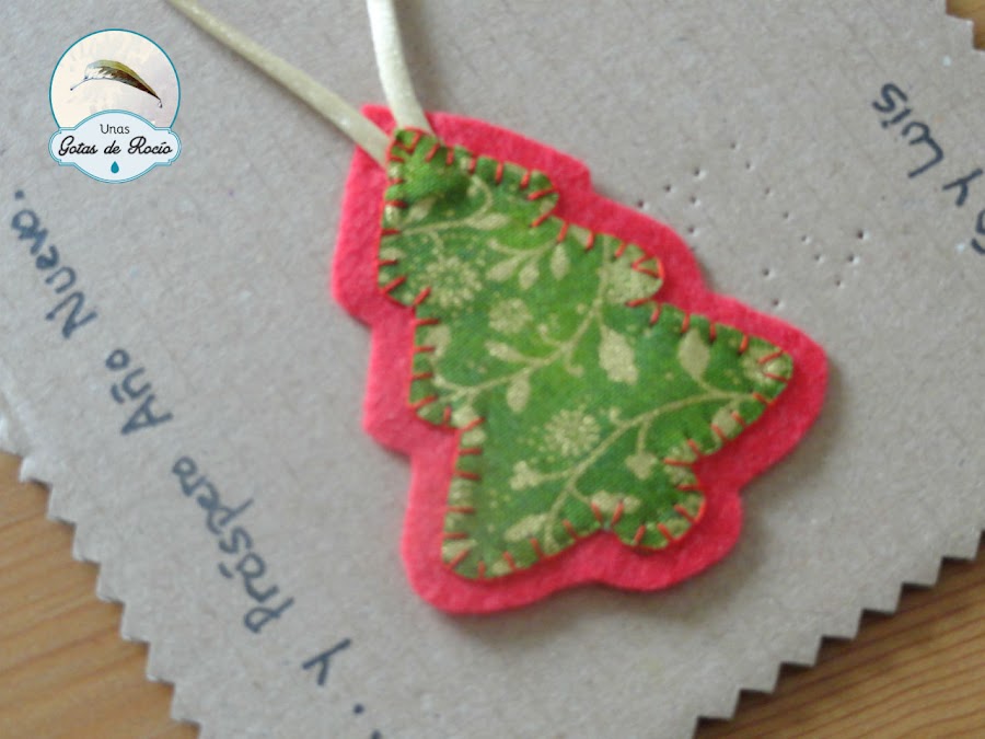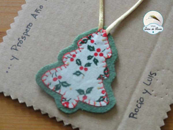 Tarjetas sencillas a partir de un cartón y una flor de fieltro, cuerda y arbolito de Navidad que sirva para adornar Navidades futuras y recordar ésta que muy pronto será pasada.