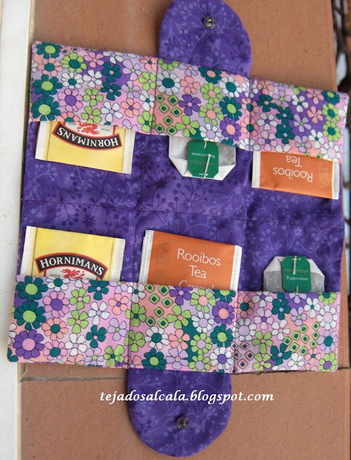Piluki es como llamamos cariñosamente a Pilar una de los miembros más activos de nuestro grupo de Pach y que siempre nos está liando para hacer pequeños proyectos que a parte de ser bonitos, son bastante prácticos. La ultima ocurrencia ha sido hacer este guarda infusiones, bueno, no se como llamarlo, pero se meten las bolsitas de las infusiones y se pueden llevar en el bolso. Alguna de las chicas han modificado las medidas para convertirlo en un guarda paquetes de agujas. Así queda cerrado.