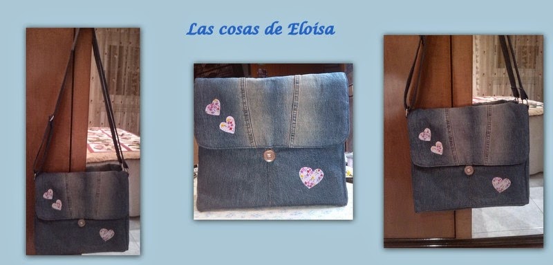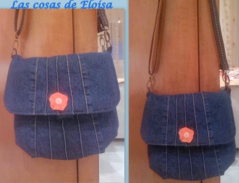 Este también en tejano,a este le bordé el asa es de un tamaño más pequeño,pero muy llevadero por que no pesa mucho,a mi es que los bolsos me gustan no muy grandes.