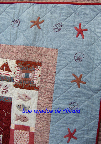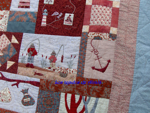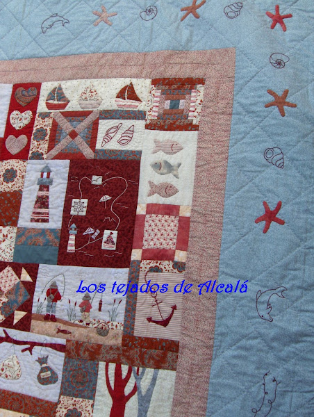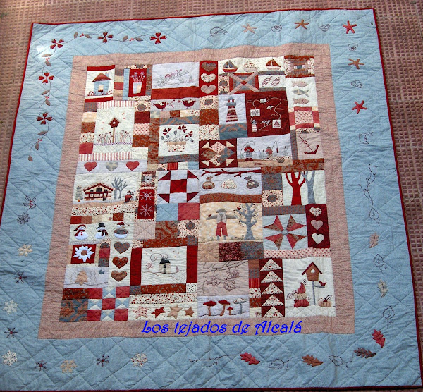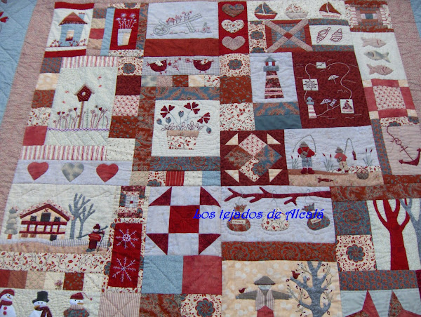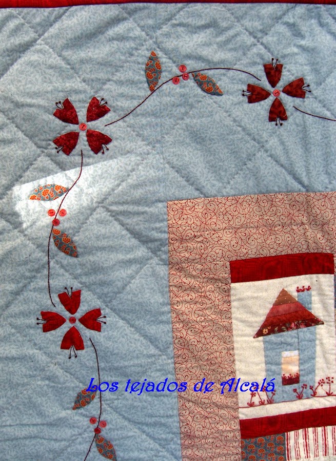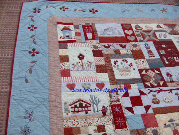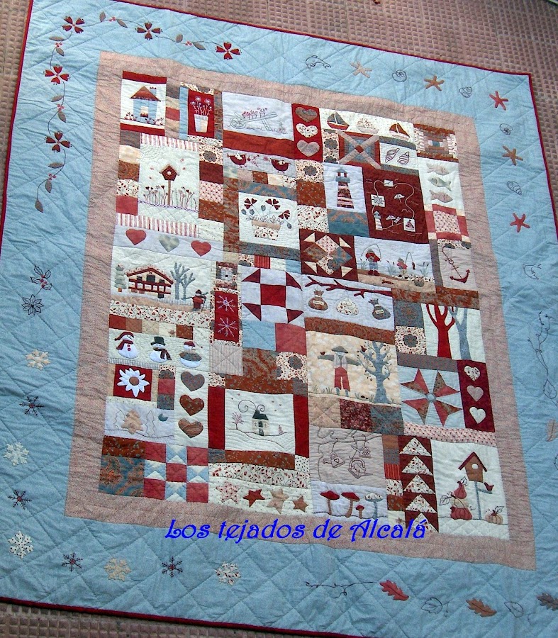 Este proyecto comenzó hace casi dos años con una primera puntada en la casa de invierno. Después de todo este tiempo y miles de puntadas, alegrías, decepciones, tirar la toalla y volverla a recoger, por fin lo terminé. Mide dos por dos y medio. Nunca había hecho nada tan grande. El muleton es bastante gordito, por eso me ha costado tanto el acolchado a mano, pero merecerá la pena cuando en las noches de invierno me acurruque bajo él.