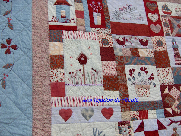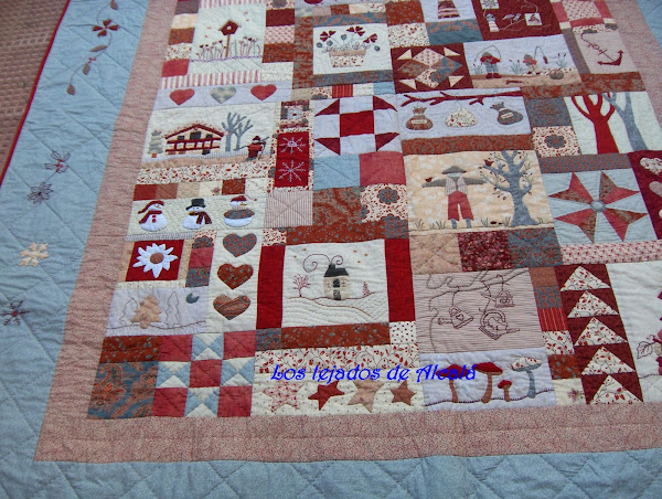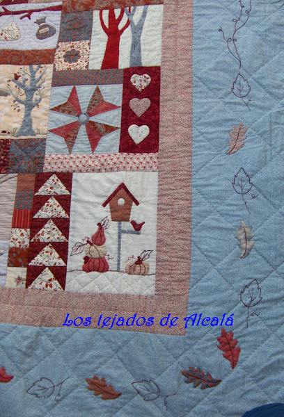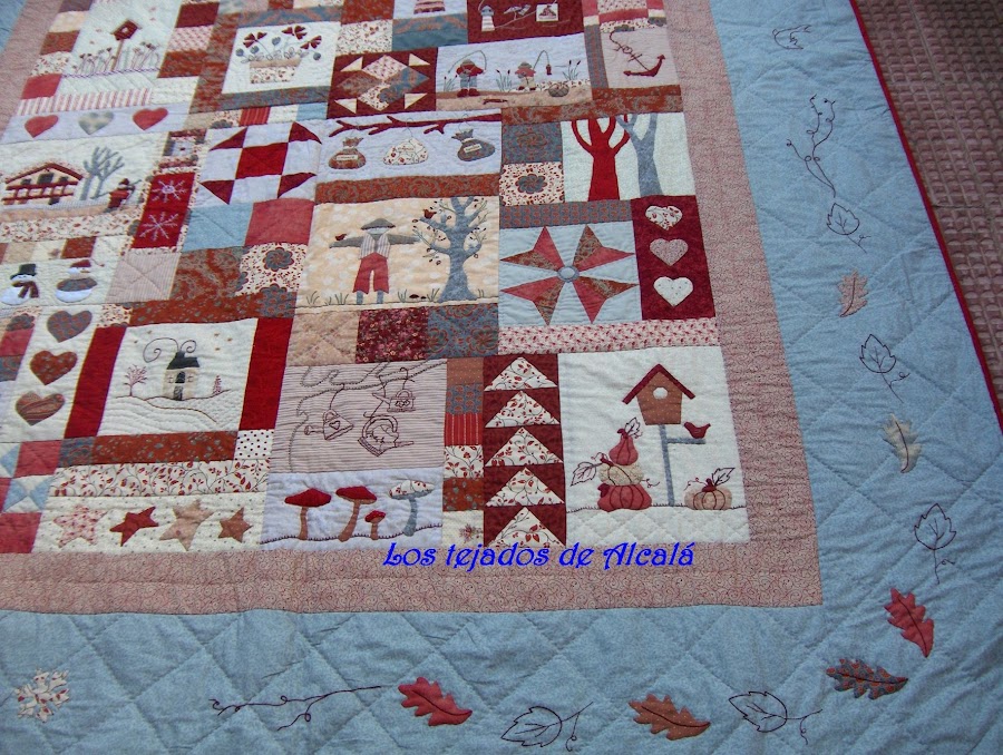 Los bordes no los he hecho como el original. No me gustan las palabras en los quilt. Unas sencillas aplicaciones y bordados relativos a cada una de las cuatro estaciones han enmarcado el trabajo principal.