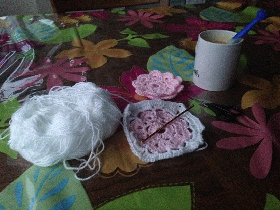 Esta mañana me he levantado prontito, aprovechando que todos dormían, y con mi café mañanero, he adelantado bastante mi mantita de flores de colores. Hay poca luz en la foto porque todavía no había amanecido.