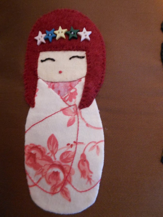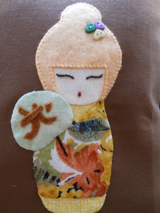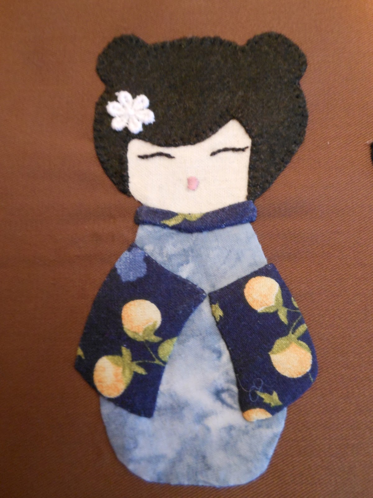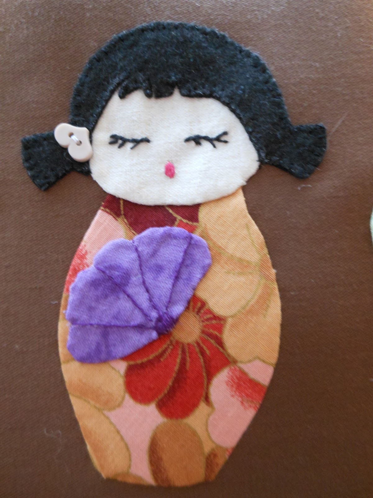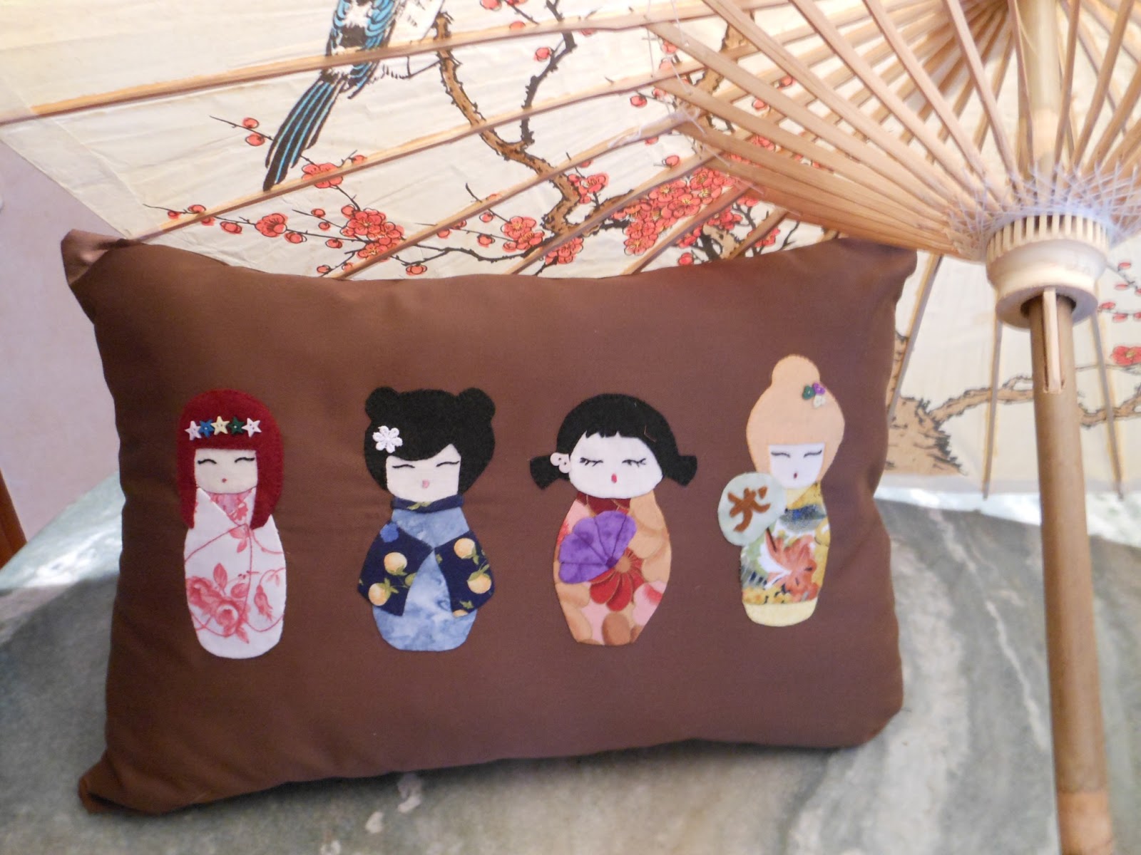Hola amigas, aunque un poco tarde, esta noche quiero presentaros , este cojin con 4 kokesis, que se va a ir para Marbella a casa de una amiga, muy querida para mí, y que sé que le hace mucha ilusión, porque ya lo ha visto y le encantan como a mí ,esas pequeñitas muñecas, tradicionales del norte de Japón, talladas en madera a mano, y que se caracterizan por tener solo el tronco y la cabeza, sin brazos ni piernas