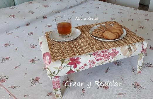 Esta mesita está hecha con una caja de madera o huacal de frutas, forrada con un retazo de tela.