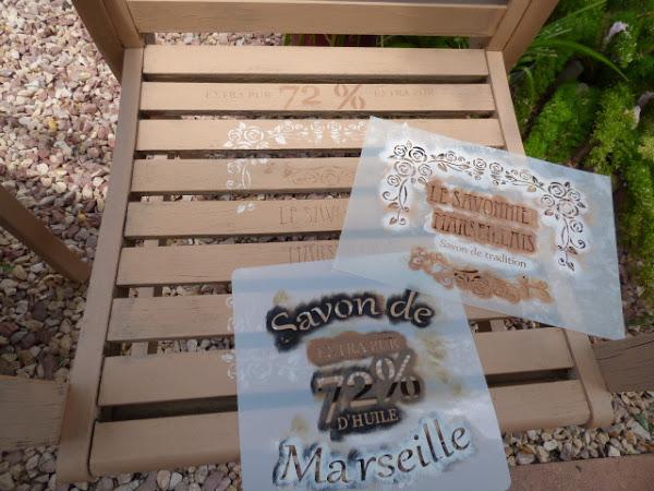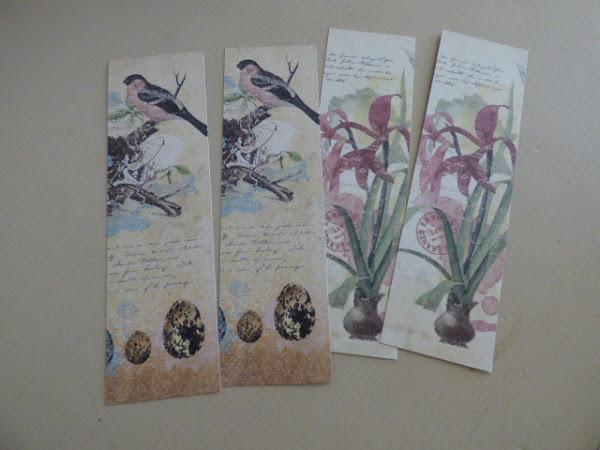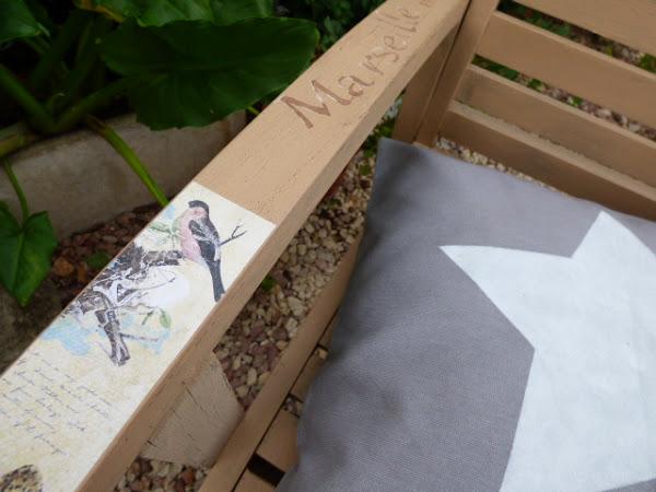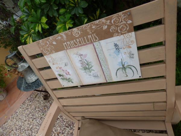 Una vez pegadas las maderitas en los respaldos y hechos los estarcidos en el asiento, no sé....las veía sosas...les faltaba algo y pensé en aprovechar algún recorte más de los papeles. Corté 4 piezas iguales, del ancho de los reposabrazos