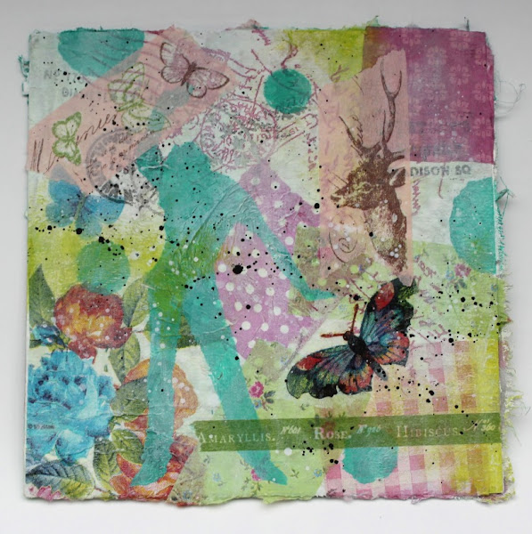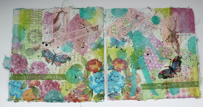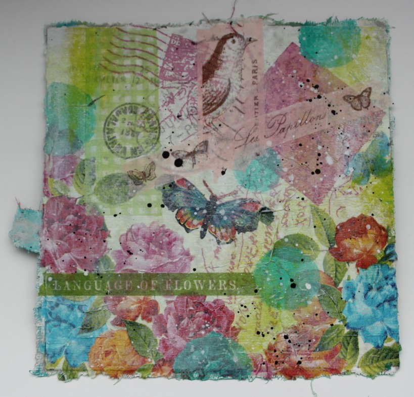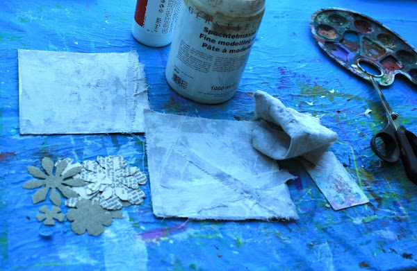 Decidí hacer las tapas tomando varias de las técnicas y los materiales que había usado en las páginas, ya sabes, por eso de que las tapas son una ventana del libro... Comencé con las "contratapas". Primero tapé los poros del cartón con "gesso" y después usé servilletas, para hacer un collage