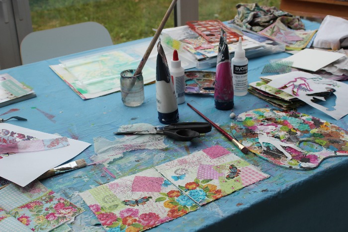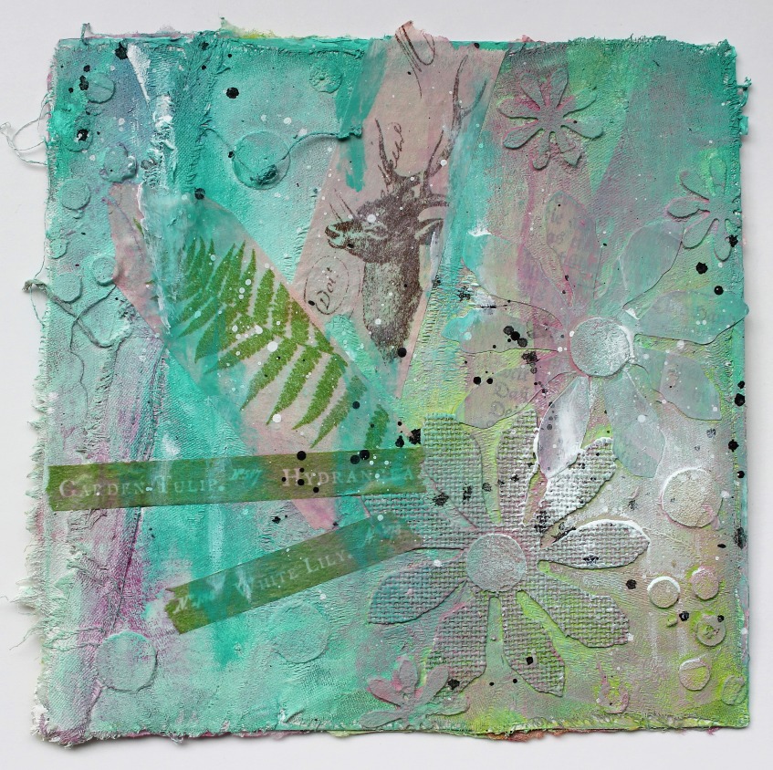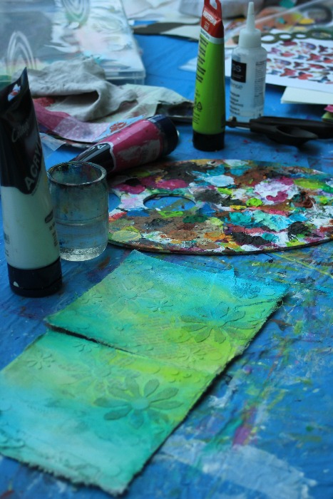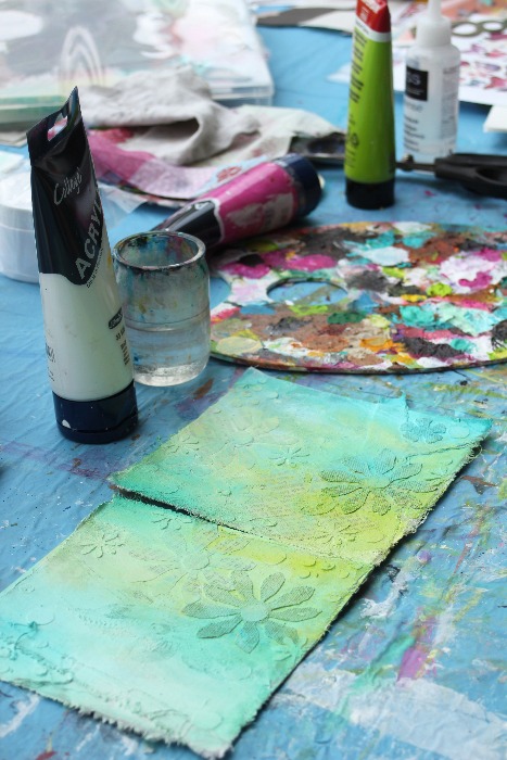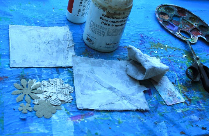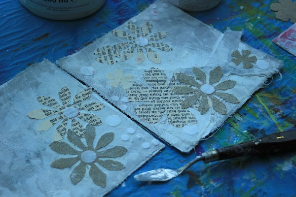 Le puse en ciertas partes el gesso y después pegué flores troqueladas, de papel de libro viejo y de lienzo (como en mi página 8). también le hice círculos con pasta para texturas