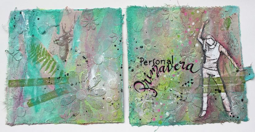 Usé también cintas "washi" ( que usé en mi primera página), la plantilla que hice para "mi yo bailador"(página 11) y acrílicos, con los tonos que usé en todo el trayecto de estas actividades: rosas, verdes y turquesa.