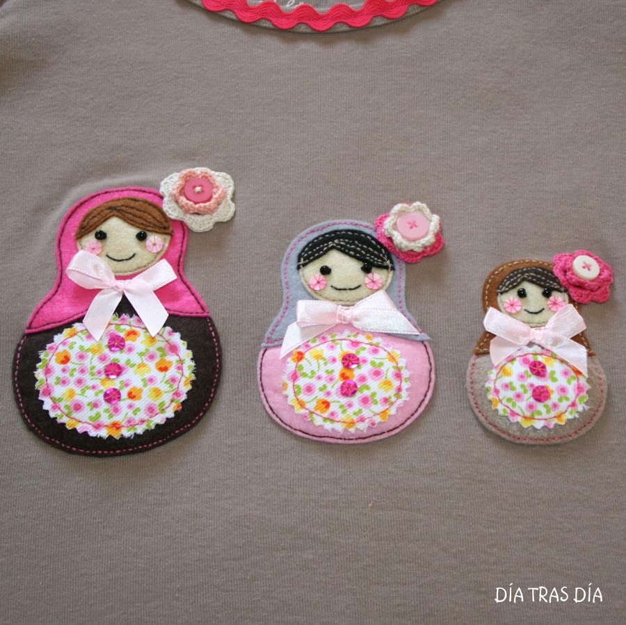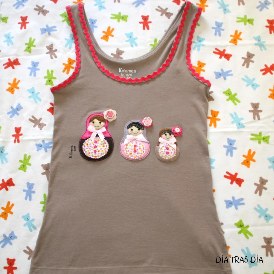 Hacía ya tiempo que me rondaba esta idea por la cabeza, de hacer varias muñecas en una misma camiseta, que fuesen variando de tamaño, como las auténticas matrioskas, pero para la primera que se me ocurrió empecé haciendo sólo una y al final así fui haciendo todas las demás que vinieron detrás.