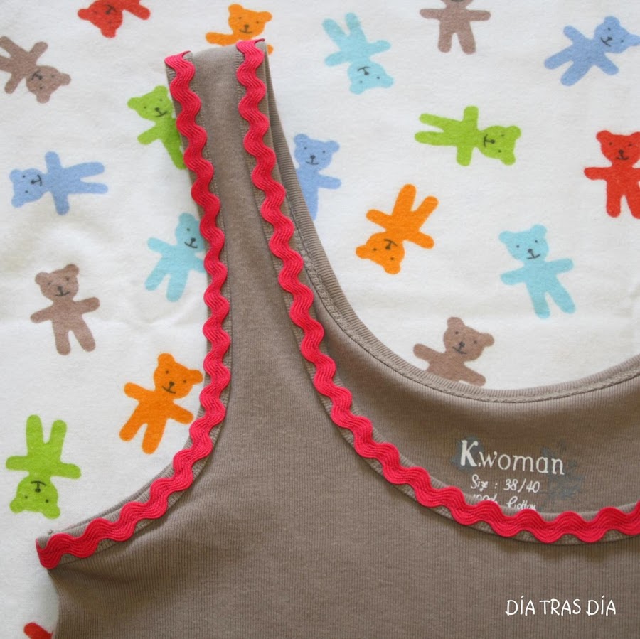 Para hacerla, he elegido una camiseta sin mangas en color café con leche y como al terminarla vi que hacía poco contraste con el color de la piel (ahora que he cogido un poquito de color en la playa...) decidí adornarla en el cuello y las sisas con una puntilla en color fucsia, que además le iba totalmente a juego con las matrioskas, que hice en tonos rosas, fucsias y marrones.