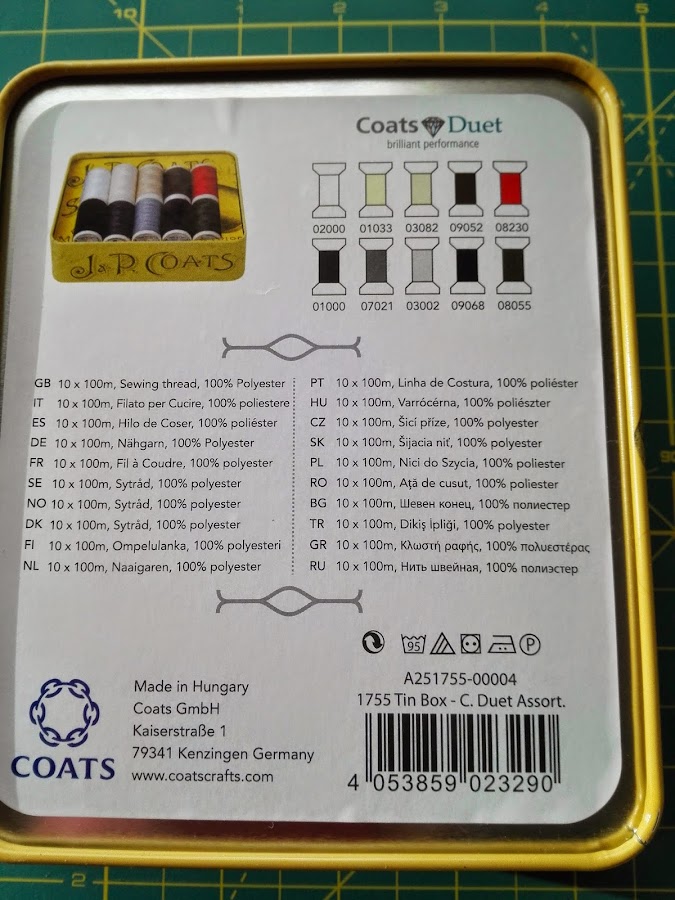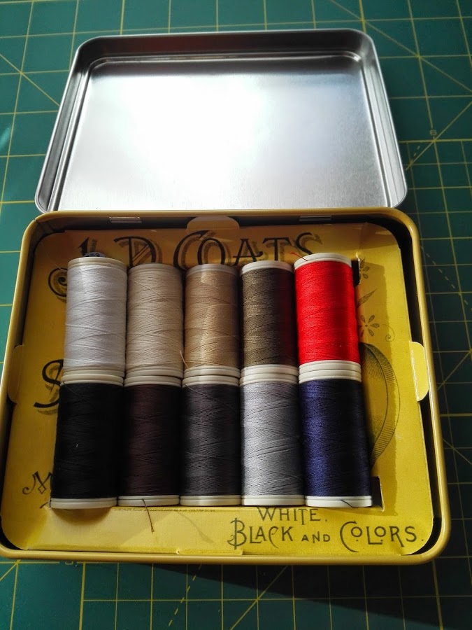 Trae 10 bobinas de hilo de coser 100% poliéster con 100 m de hilo en cada bobina. Los colores son los mas utilizados y no pueden faltar en nuestro costurero. Con ellos tendremos solucionado cualquier imprevisto. Los colores son blanco, marfil, beis, marrón oscuro, rojo, negro, gris oscuro, gris claro, azul marino y verde kaki. Los coloco según vienen en la parte posterior de la cajita.