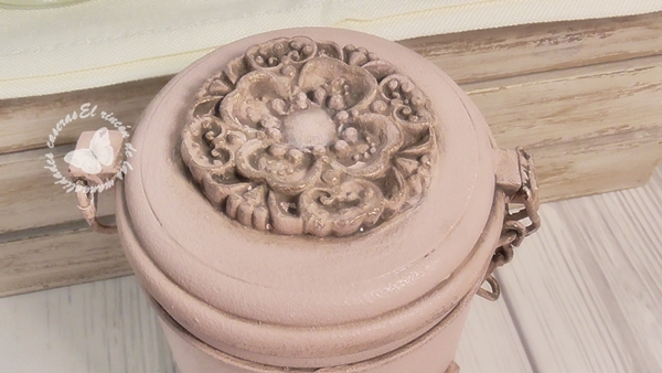 He utilizado unos aplique que he hecho con pasta de modelar y unos moldes estilo vintage, que he pegado con cola blanca a la lata, lo siguiente una imprimación para metales o gesso, así tendremos un mejor agarre de la pintura y nos durará más tiempo la decoración.