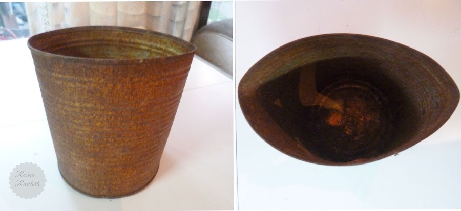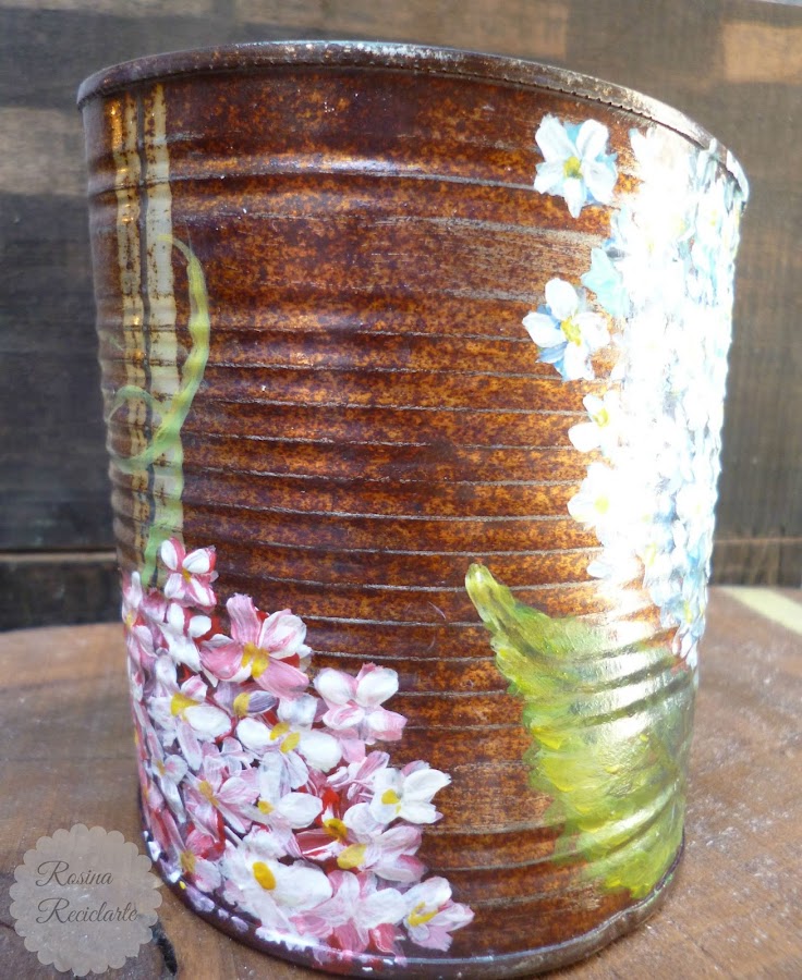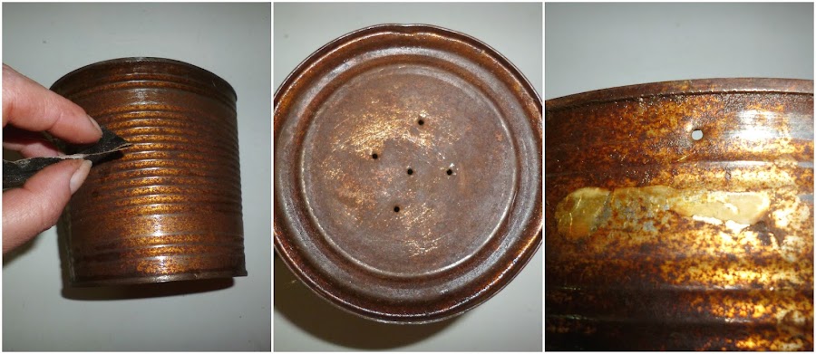 Osea,en casero: Latas que dejo a la intemperie con el solo propósito de obtener un contenedor hermosamente oxidado,que luego voy a usar en "algo". En este caso;lata aplastada por perrita = Maceta