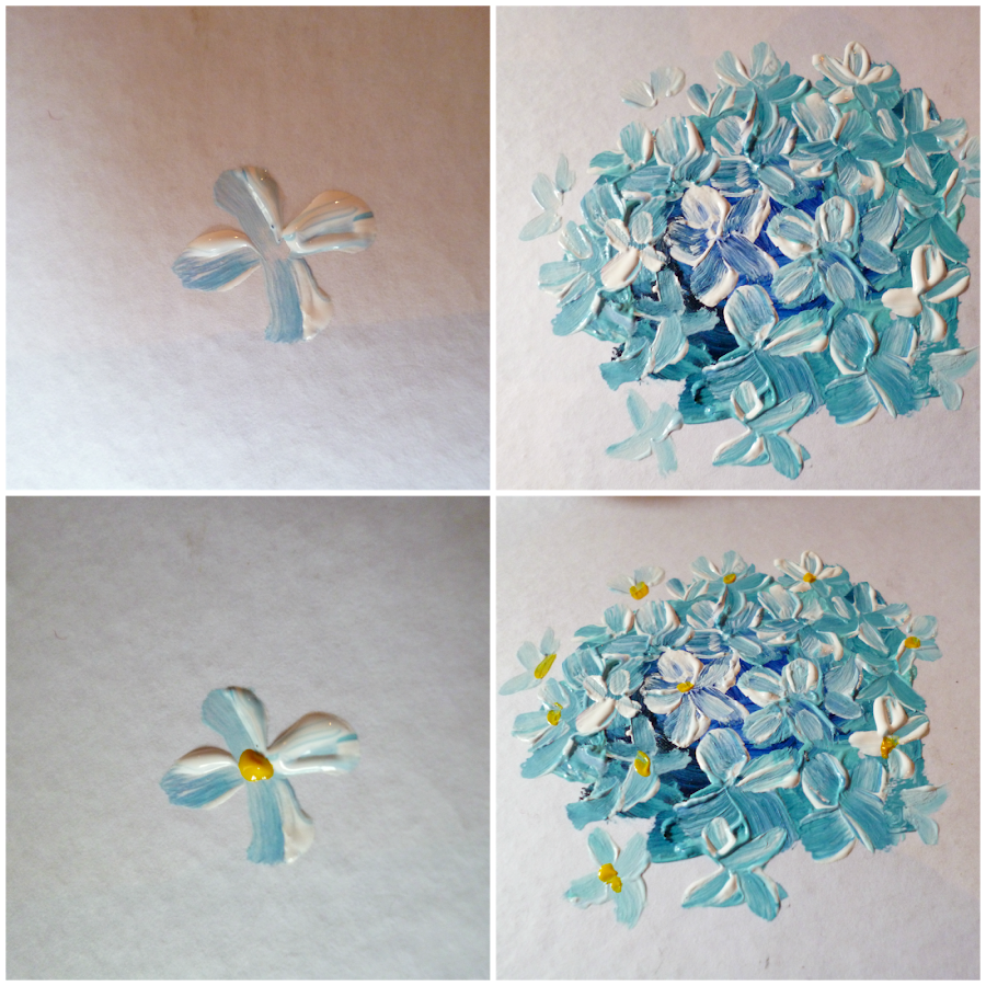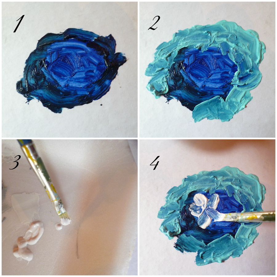 Una mancha de varios colores,unas pinceladas cortas con blanco que simulan 4 o 5 pétalos.