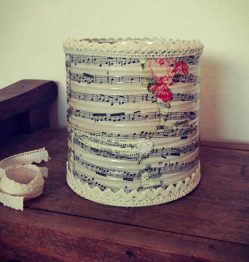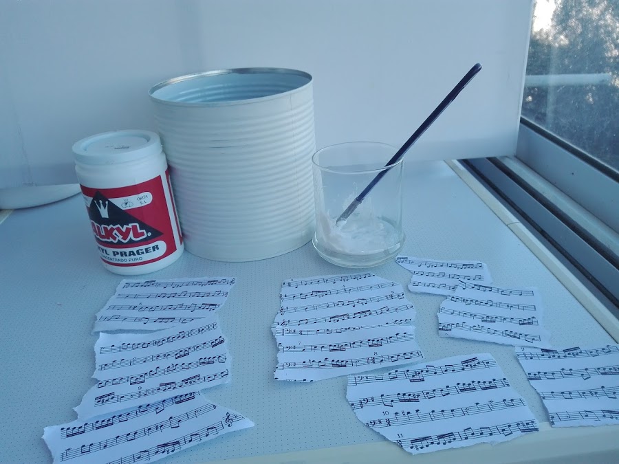 El primer paso ha sido pintar la lata, para que los elementos del collage se puedan ver bien. os recomiendo rasgar el papel - en este caso las pautas musicales - a mano, porque permite tener un mejor resultado en el colage que si los cortamos con las tijeras.
