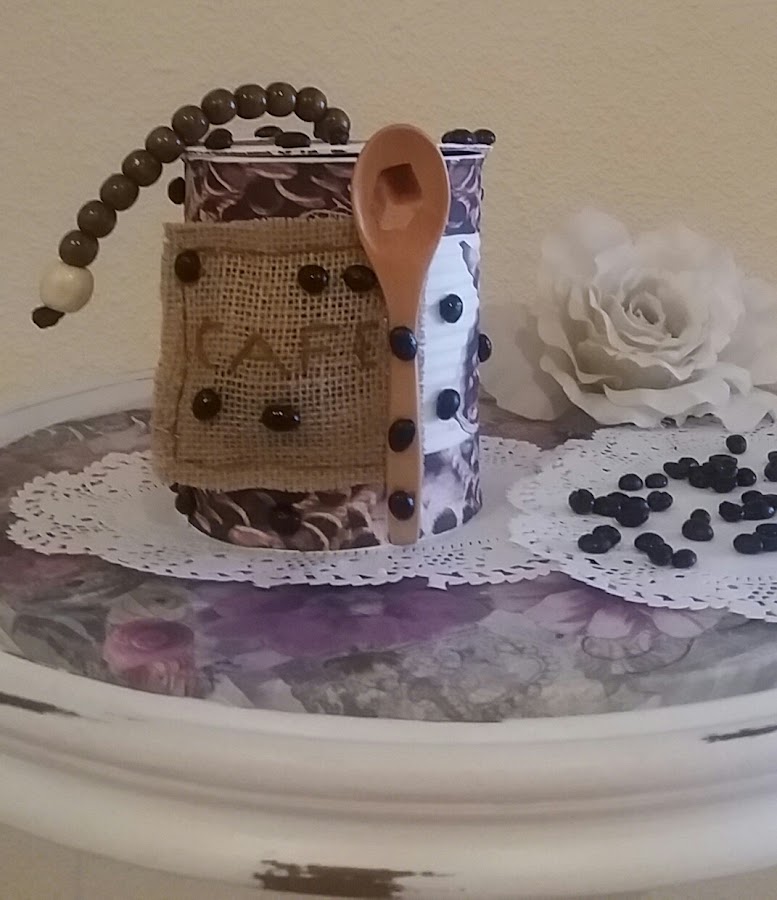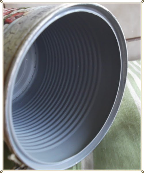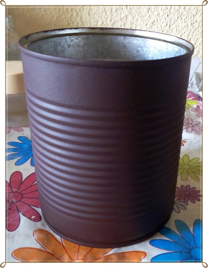 Primero aplasté todo el filo de la parte superior de la lata, para evitar problemas de cortes. Luego, después de limpiar bien y eliminar restos de etiquetas y pegamentos, pinté la lata con pintura tiza en color chocolate. Ya sabes que la pintura tipo tiza cubre muy bien y en este tipo de trabajo no hace falta dar imprimación. Por dentro la pinte en color gris perla.