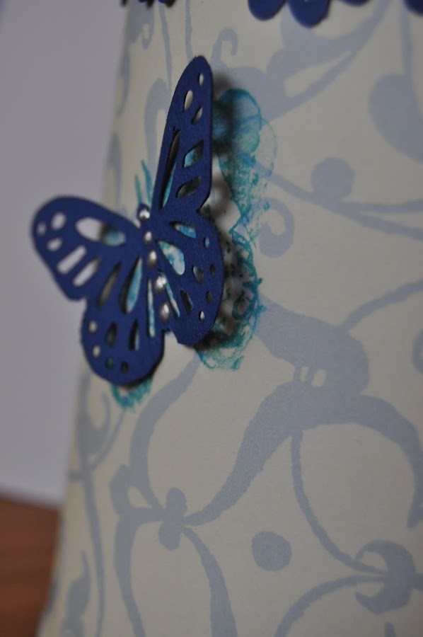 La decoré totalmente con papeles y troqueles scraperos. Sobre un papel del famoso "tacopapeles de María", le puse en la parte de arriba un troquel de bordes que me gusta mucho porque hace el efecto de una puntilla. Luego pequé un troquel de un maniquí (a ella le gusta mucho la costura: patchwork, fieltro....) adornado con unos brillantitos en la cintura y liquid pearl en el resto del motivo. En los laterales iban unas mariposas de Martha Steward.