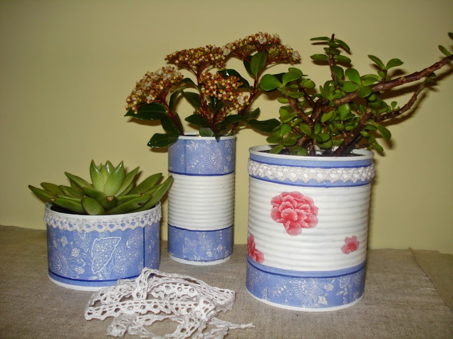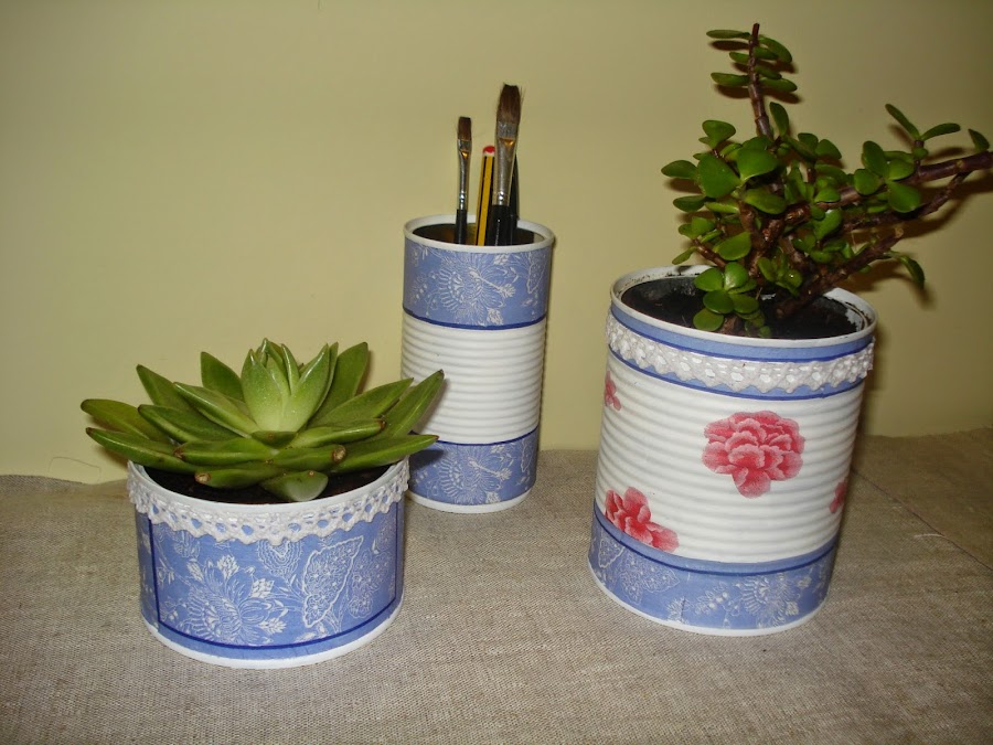 Os muestro unas latas que he reciclado, las utilizaré una como lapicero y dos como macetas para plantar unos cactus.