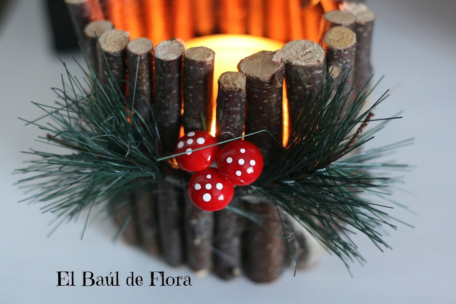 Después pegamos nuestra composición navideña. Y así, de esta forma tan sencilla tenemos nuestro Candelabro navideño. Ponemos una vela y nos da una luz de ambiente cálida y acogedora.