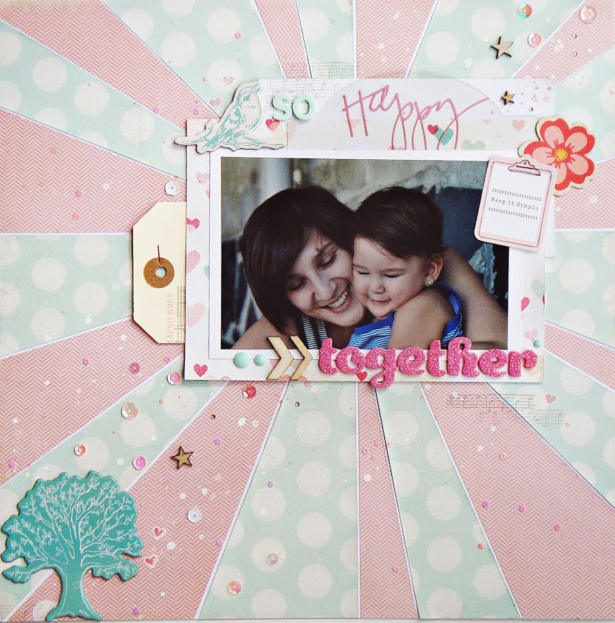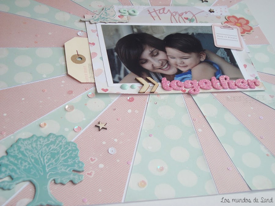 Capas imitando a los rallos del sol, adornos de American Crafts y Studio Calico, goterones (desde el taller de Ana Manzana no soy la misma, jajaja), sellos, lentejuelas... y un montón de ganas de scrapear completan el trabajo.