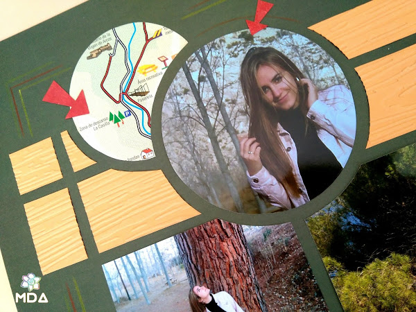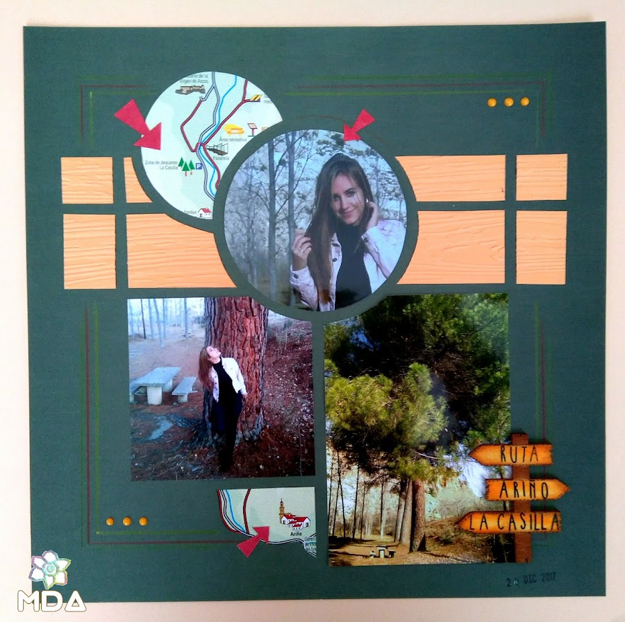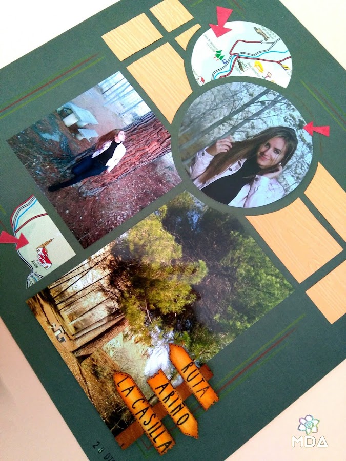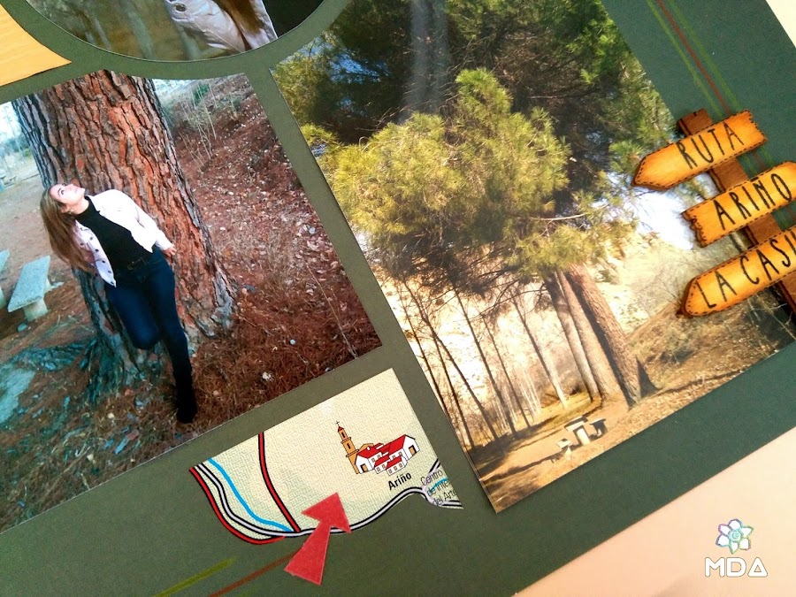 Utilicé una plantilla que ya tenía desde hace años Rêve! con la que trabajé las fotografías y el mapa, por supuesto. Para el fondo una cartulina en verde oscuro y pequeños adornos, como el poste indicador de madera, nada más porque si hay algo que caracteriza al scrap europeo es ese aspecto limpio y cuidado donde las fotografías son las protagonistas.