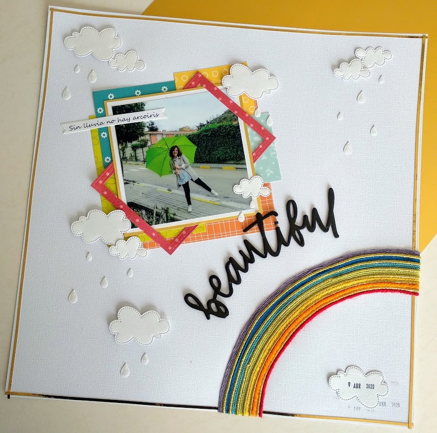 En mi layout dedicado a estos días no podía faltar el arcoiris, este en concreto está hecho con lanas e hilos y además tiene un punto dorado. ¿Es o no bonito?