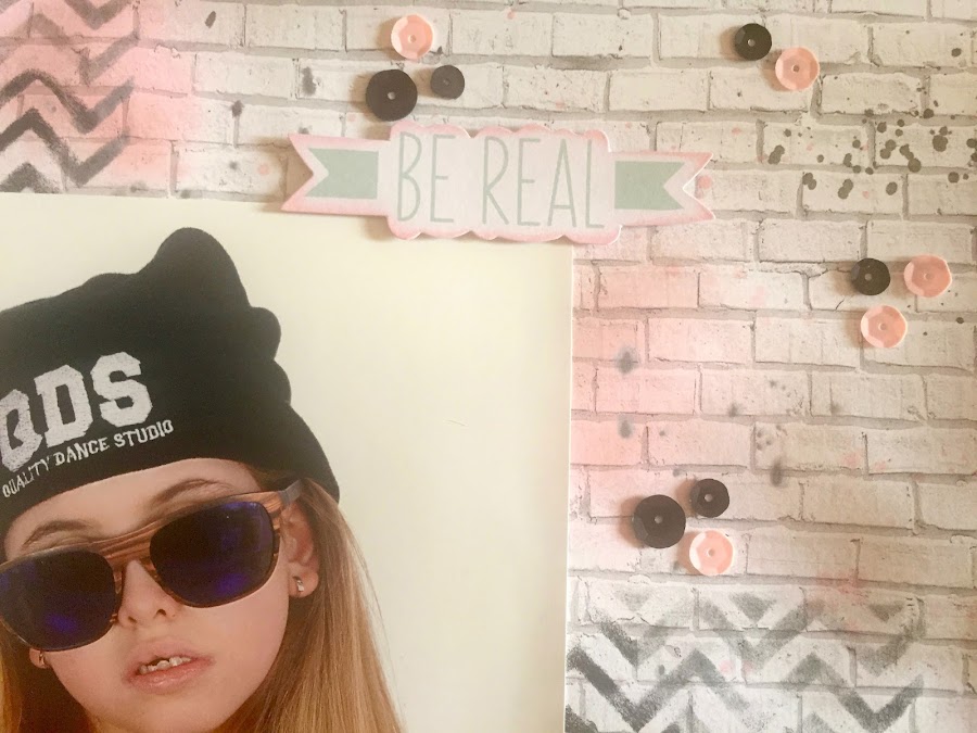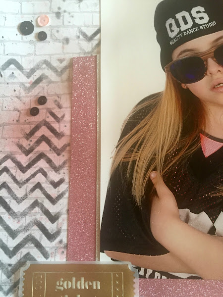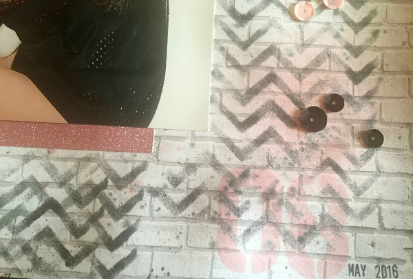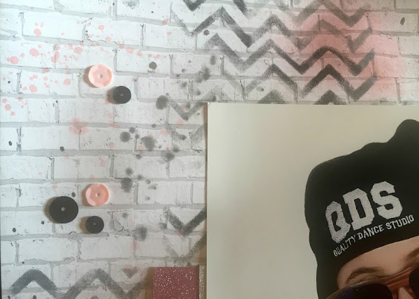 El fondo de este papel es de baldosas blancas de Studio Calico el modelo Felix, luego use un stencil aplicando tinta negra, tintas en spray en tonos rosas, algunas decoraciones como die-cuts, washi-tape rosa con purpurina y algunas lentejuelas y por ultimo con tinta en spray en negro salpique unas cuantas gotas negras.