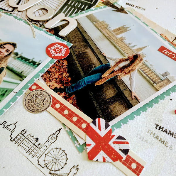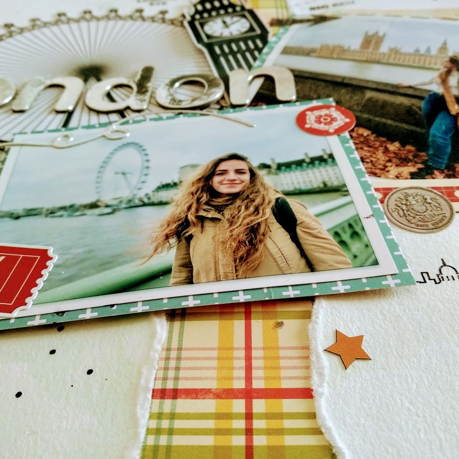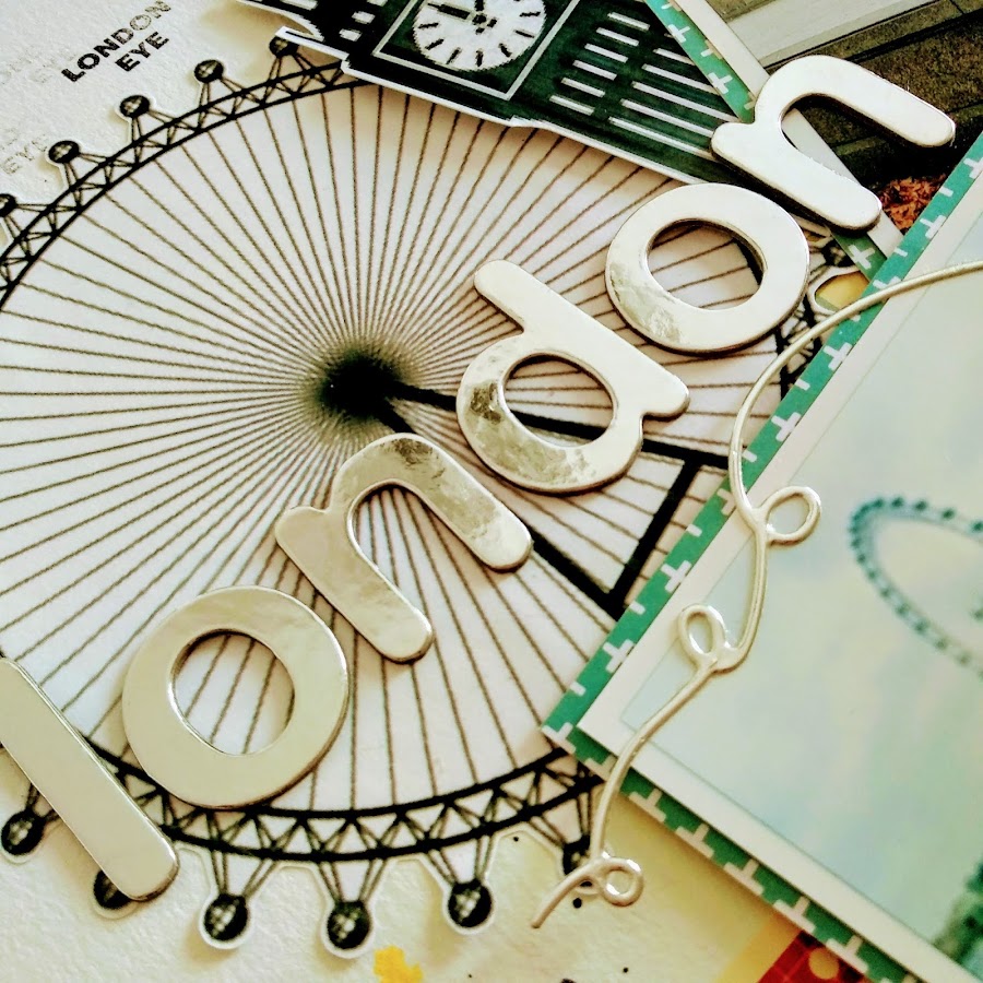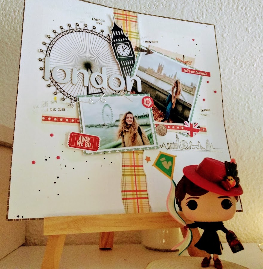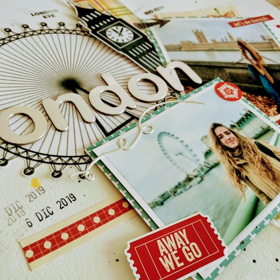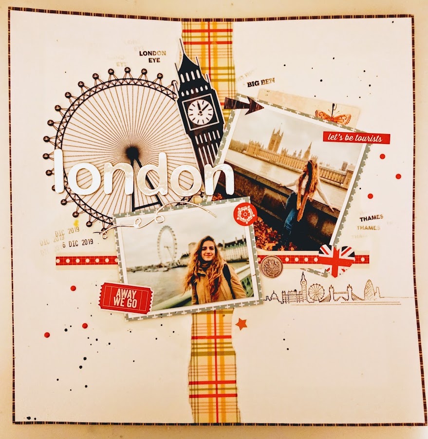 En esta ocasión es un layout con dos fotografías y una composición vertical marcada por el papel central que recorre de arriba a bajo la página. Un elemento circular (que he aprovechado para colocar la imagen del London Eye) y el título en el cuadrante superior izquierdo. Al final del post te dejo el sketch propuesto en el grupo projectlifescrapybee de ScrapyFoto y que podrás seguir, e incluso participar en el reto, si te apetece.
