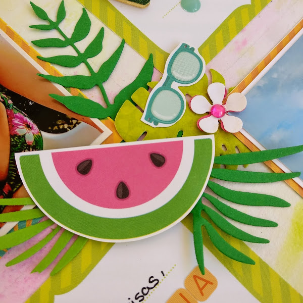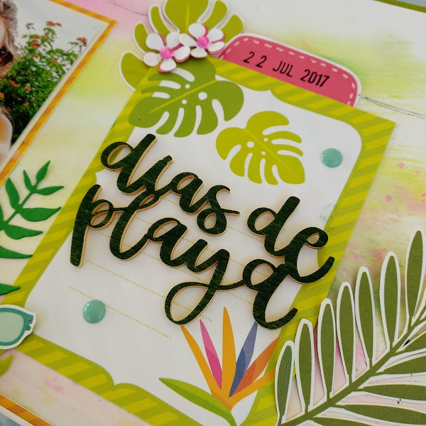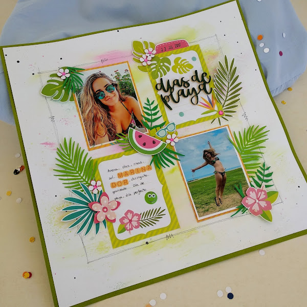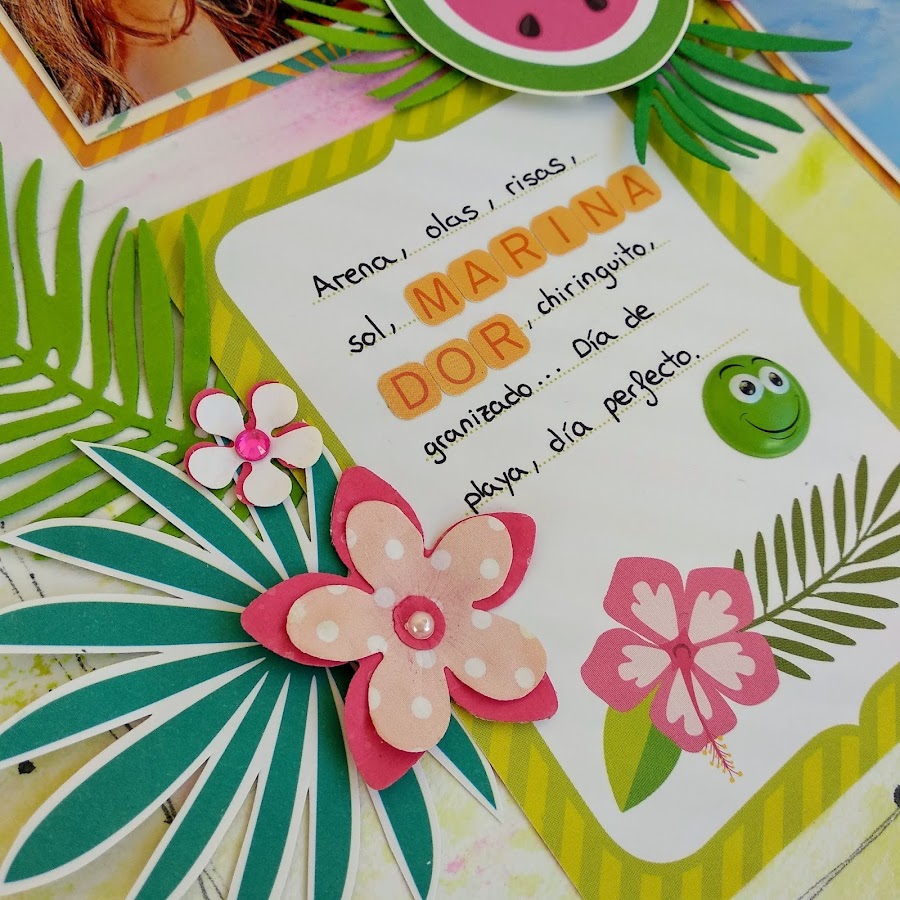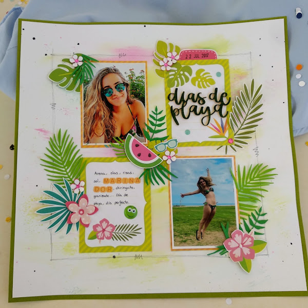 Así ha quedado mi interpretación. Fondo con acuarelas, tarjetas y decoraciones de la colección "Mi paraíso" de Anita y su mundo y chipboard "Días de playa" de Lora Bailora.