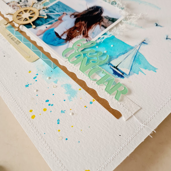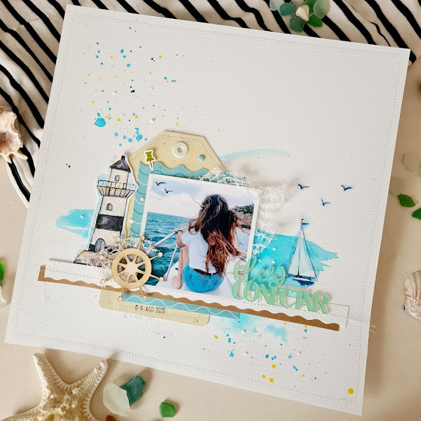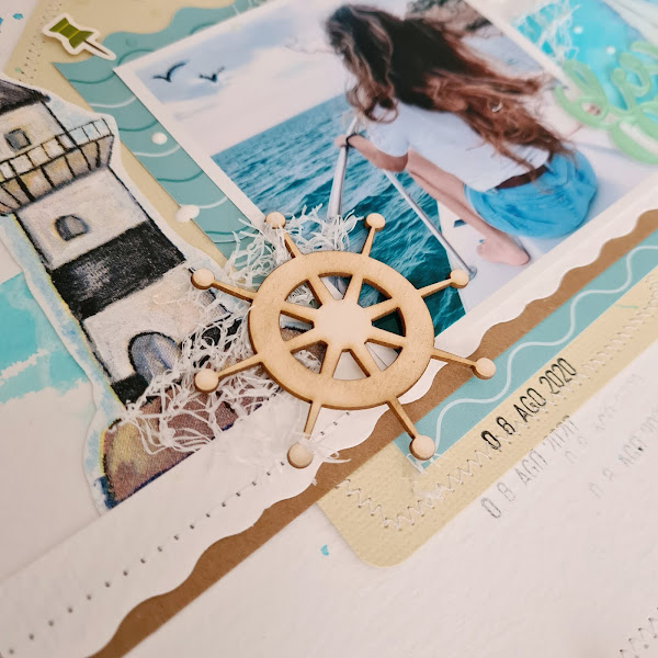Para hacer este LO usé papel de acuarela como fondo y lo manche con pigmento en un azul turquesa muy acorde con la imagen, utilicé decoraciones náuticas y el título en metacrilato en un tono que me encanta. ¡Ahhhhhh! y también añadí cosido, me estoy aficionando.