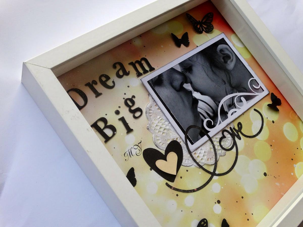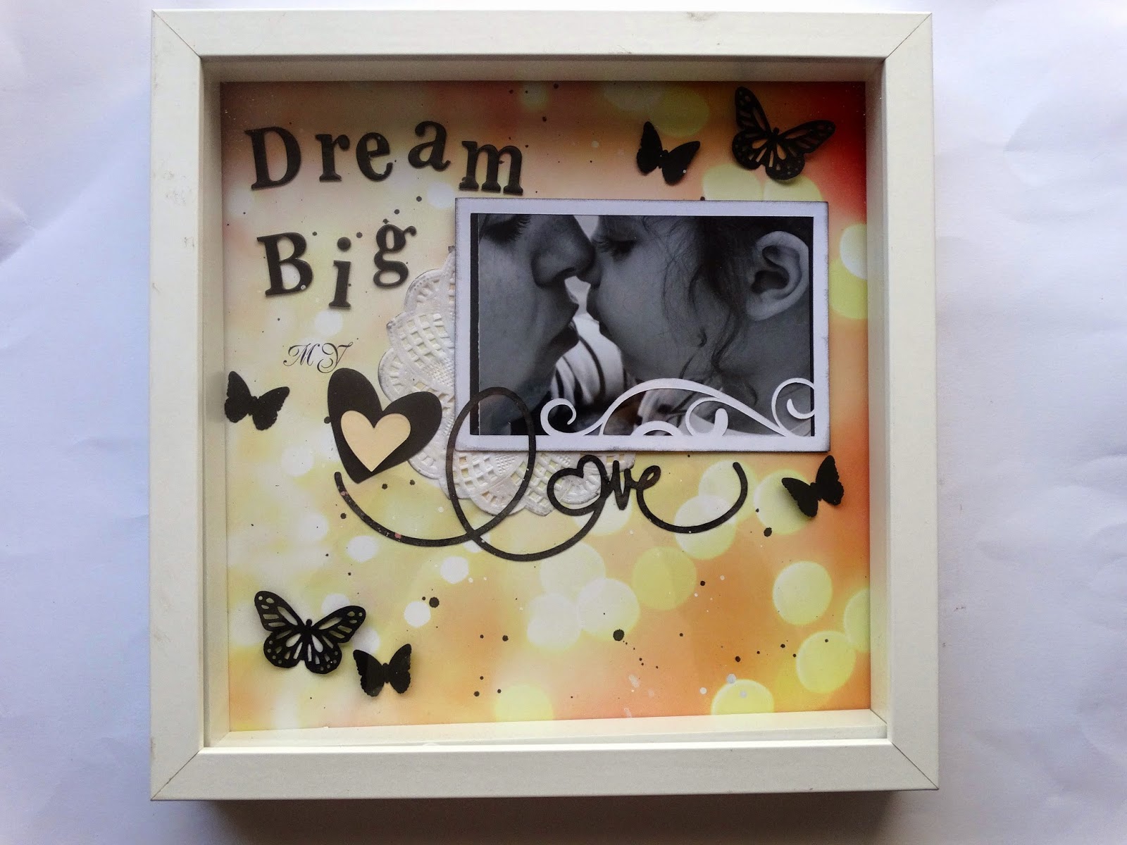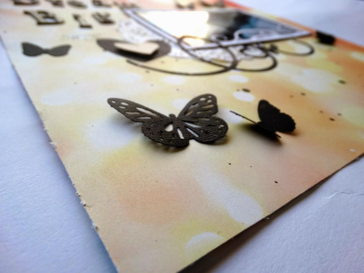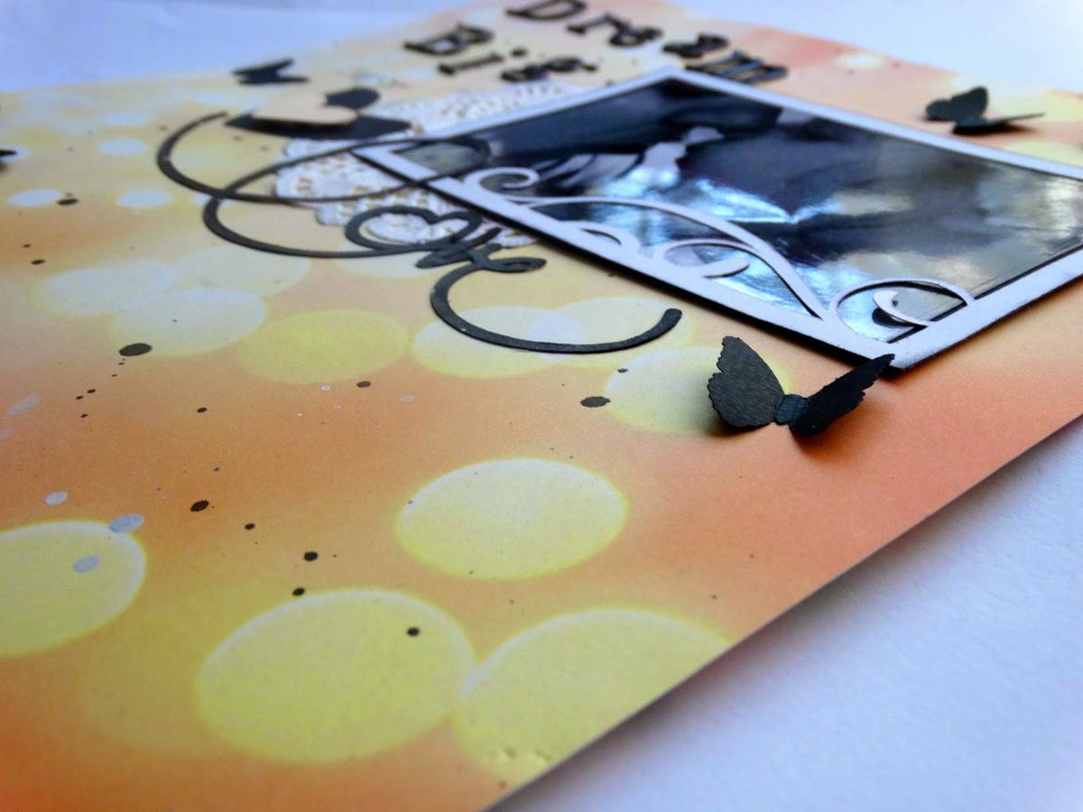 Para el fondo usé un papel decorado, aunque no recuerdo de que colección... y una foto en blanco y negro. El resto de adornos también en blanco y negro.