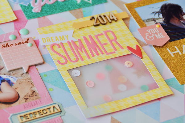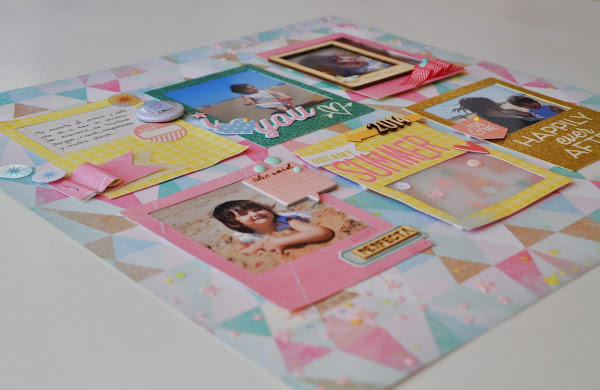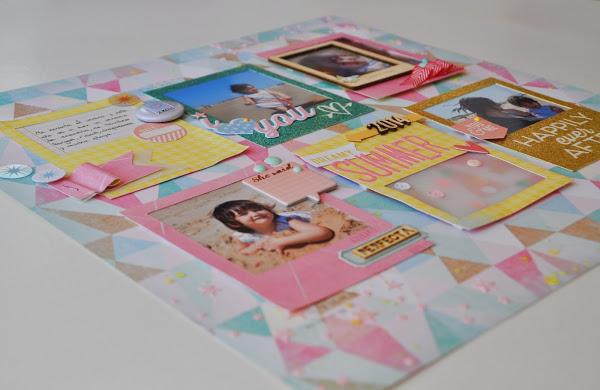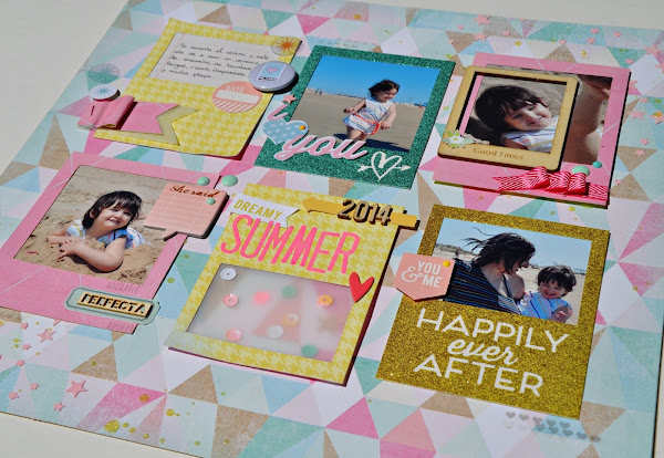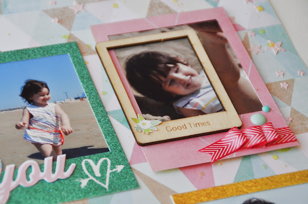 Es genial la cantidad de momentazos que da Nora, pero me cuesta mucho elegir sólo una fotografía para scrapear, ya que soy de las locas que hace setecientas fotos en un día de playa. Así que por eso en este caso decidí hacer una composición (color blocking) con varias fotografías, utilizando los marcos polaroid de Heddi Swapp y otros fabricados por mi.