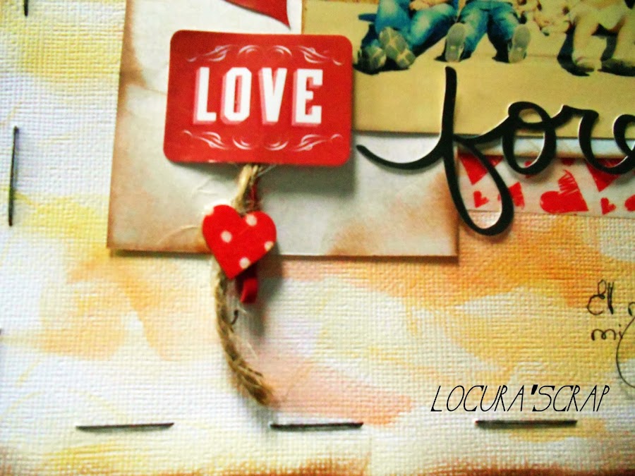 Como podéis ver en el no lleva nada de rosa , lleva hilo y muchos corazones que es lo que pedía L"atelier scrap, sigue el Sketch de Play scrap ,y ademas es un layout llenito de amor como pedía Gargamell scrap. Os dejo mas fotitos para que podáis ver mejor los detalles .